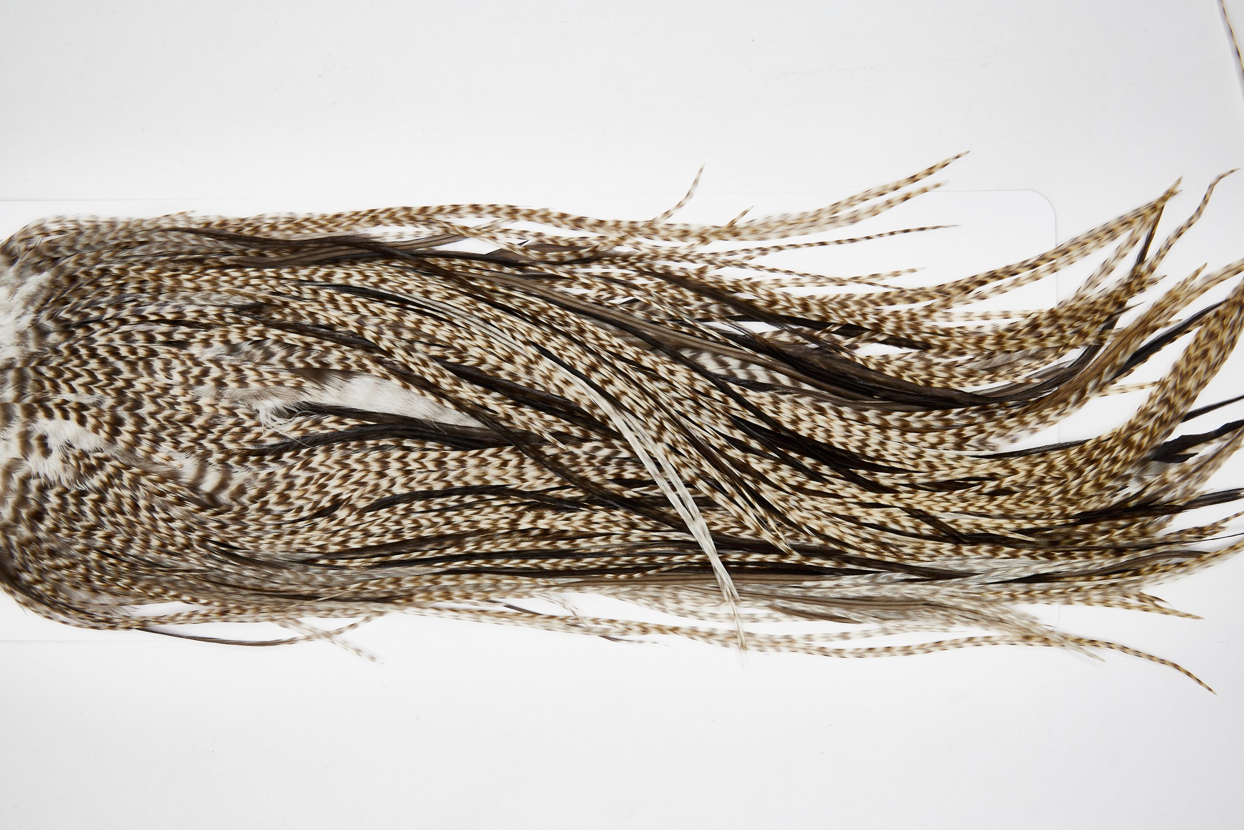 11645 is a Beaverkill Rooster Saddle of Dun Grizzly color that ties predominately size 14-16. The image shown is an actual photo of this dry fly saddle. This is NEW UNUSED HACKLE.