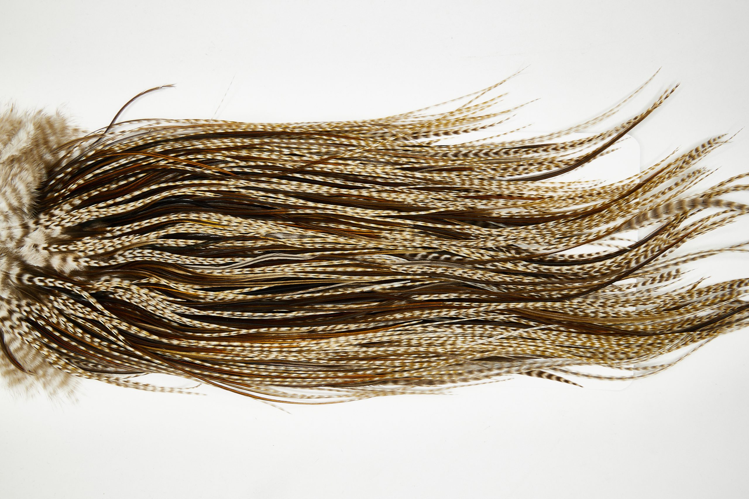 11695 is a JimsFlyCo Grade 1 Rooster Saddle of Variant color that ties predominately size 18-20. The image shown is an actual photo of this dry fly saddle. This is NEW UNUSED HACKLE.