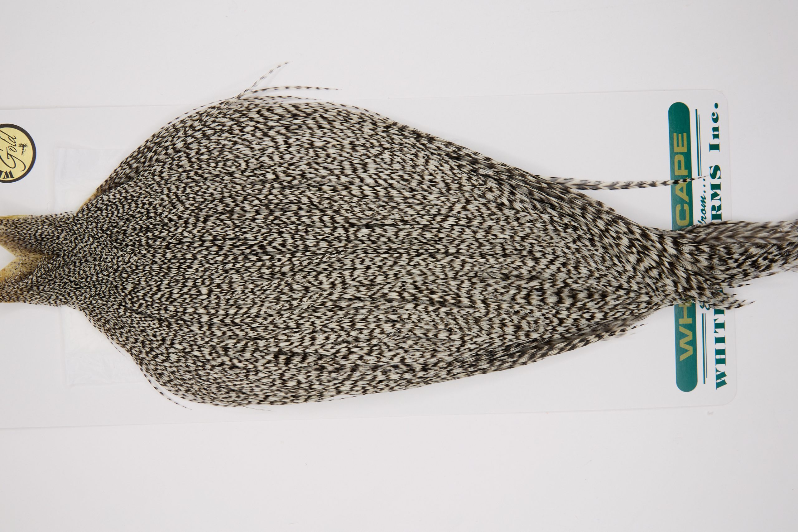 11736 is a Hebert Minor Gold Grade Rooster Cape of Grizzly color that ties predominately size 8-22. The image shown is an actual photo of this dry fly cape. This is NEW UNUSED HACKLE.