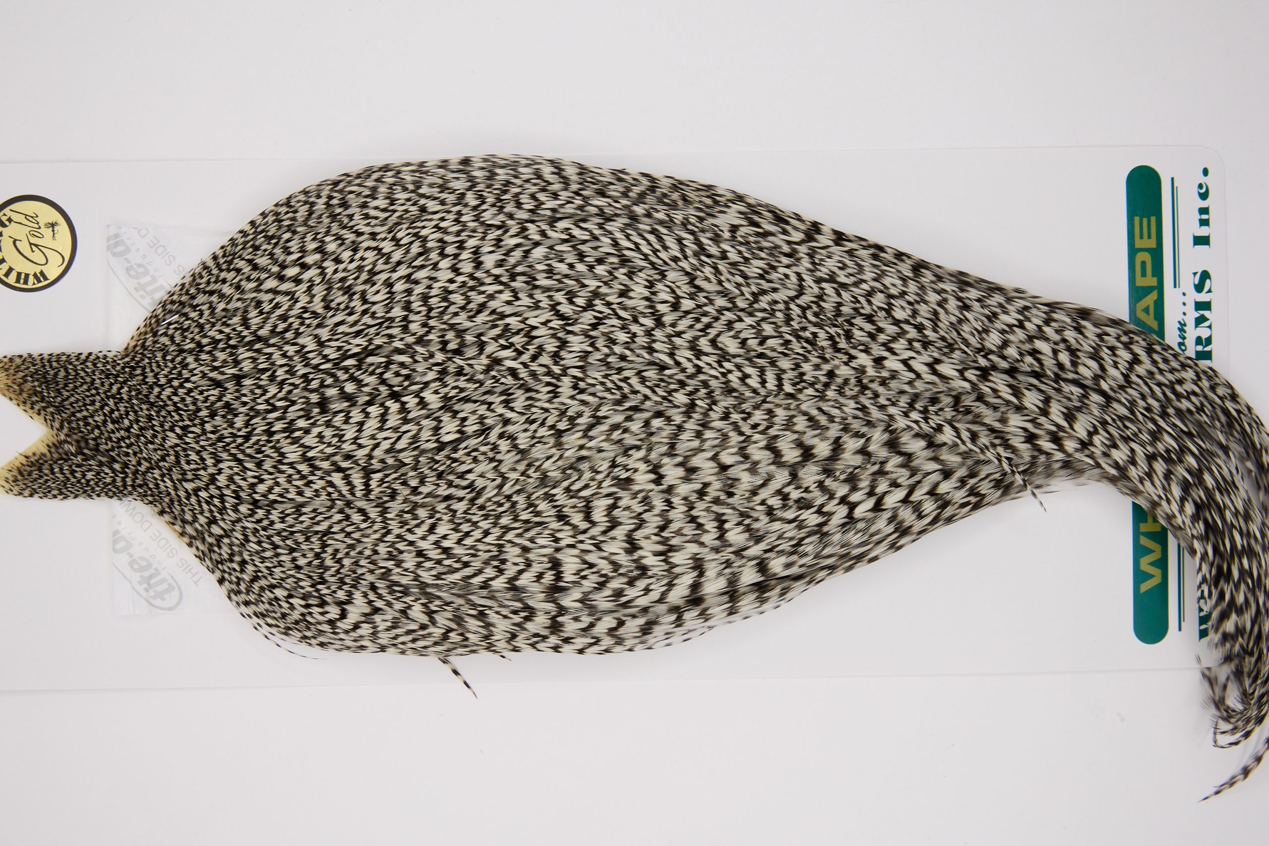 11737 is a Hebert Minor Gold Grade Rooster Cape of Grizzly color that ties predominately size 8-22. The image shown is an actual photo of this dry fly cape. This is NEW UNUSED HACKLE.