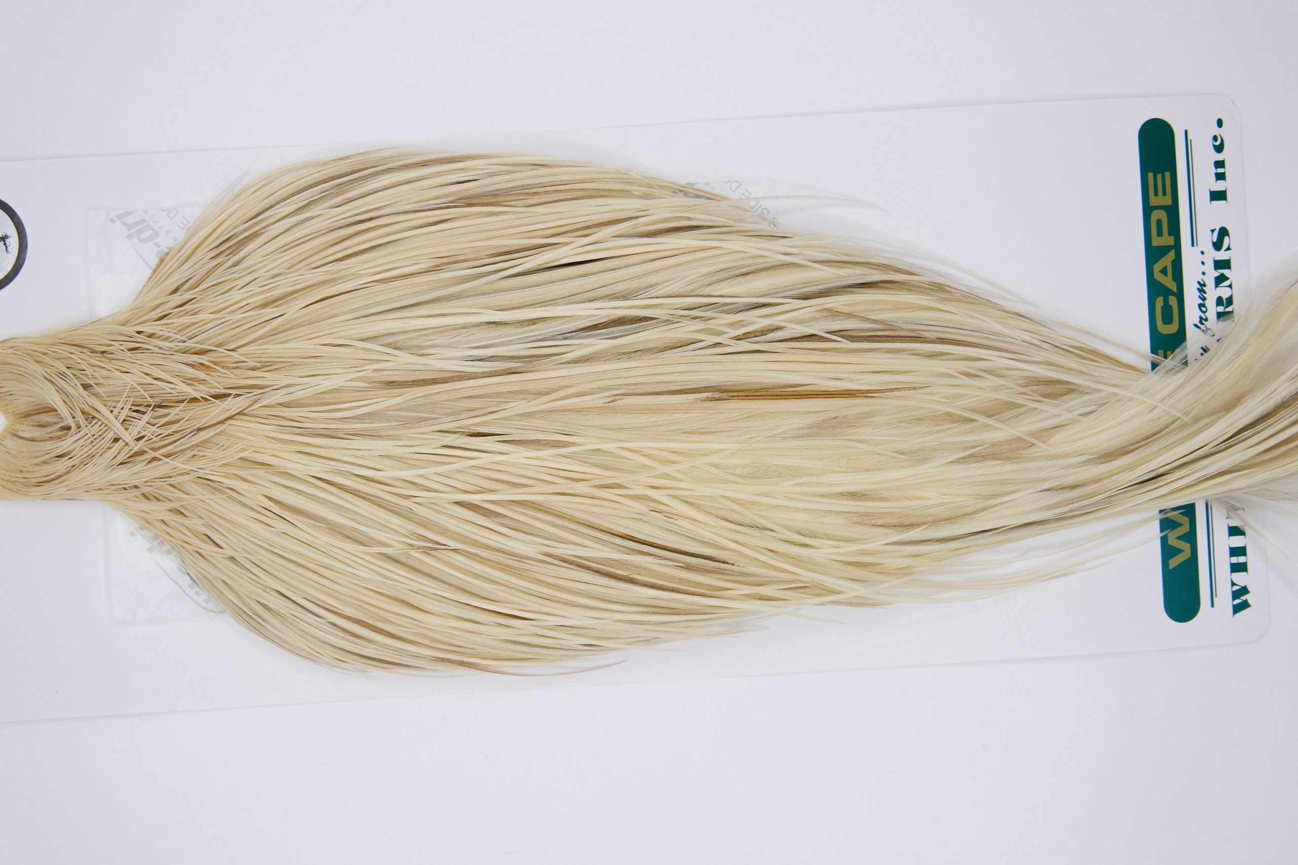 11756 is a Hebert Minor Silver Grade Rooster Cape of Pale Watery Dun color that ties predominately size 8-20. The image shown is an actual photo of this dry fly cape. This is NEW UNUSED HACKLE.