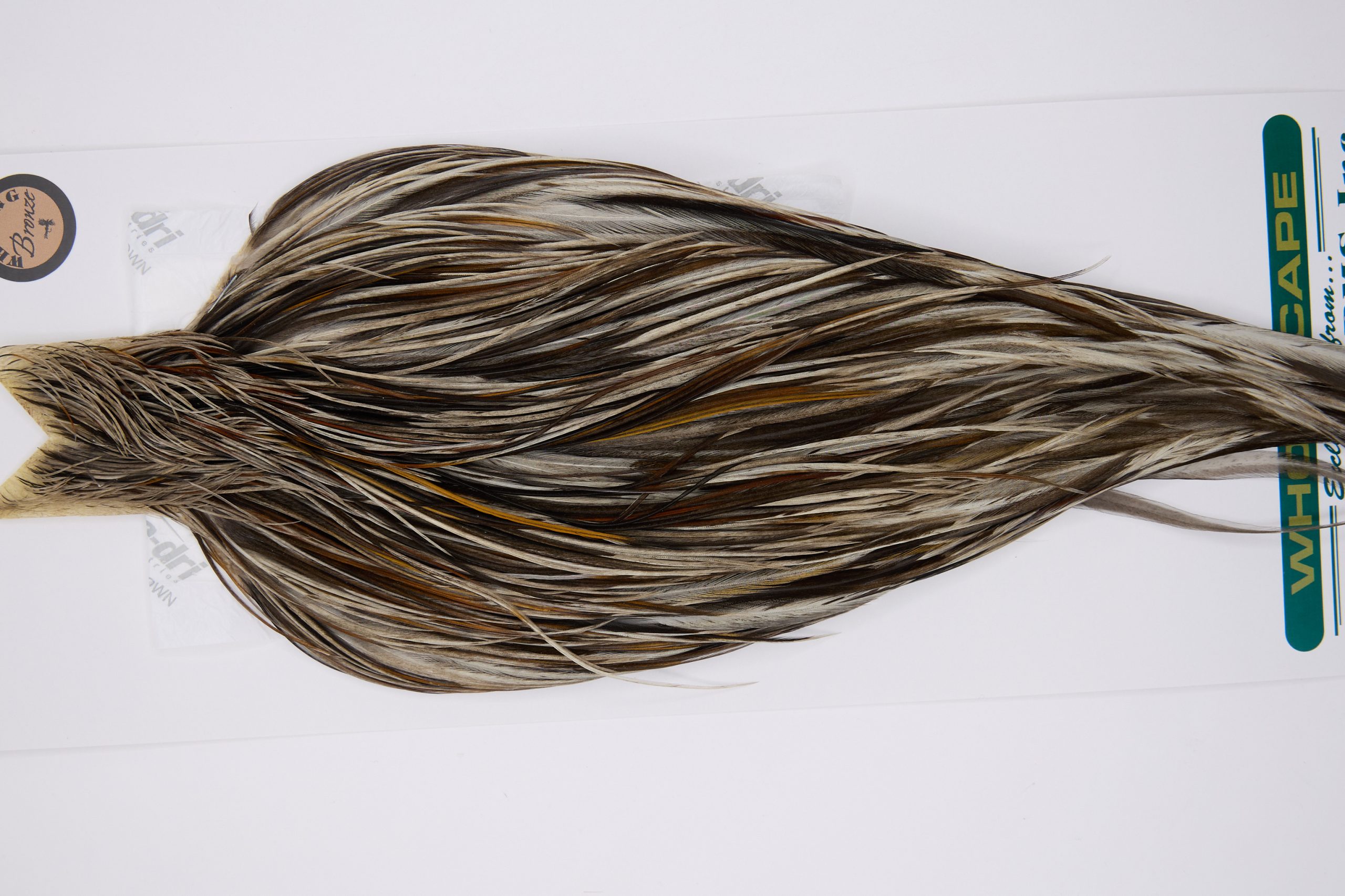 11797 is a Hebert Minor Bronze Grade Rooster Cape of Unique Variant color that ties predominately size 8-20. The image shown is an actual photo of this dry fly cape. This is NEW UNUSED HACKLE.
