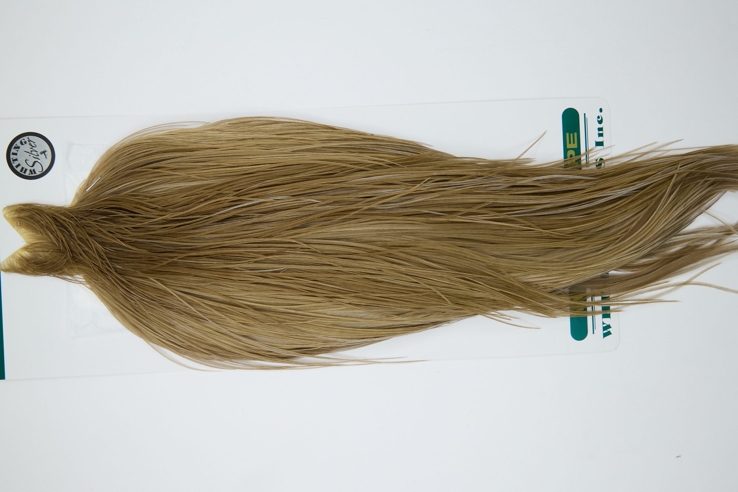 11926 is a Hebert Minor Silver Grade Rooster Cape of Medium Brown Dun color that ties predominately size 8-24. The image shown is an actual photo of this dry fly cape. This is NEW UNUSED HACKLE.