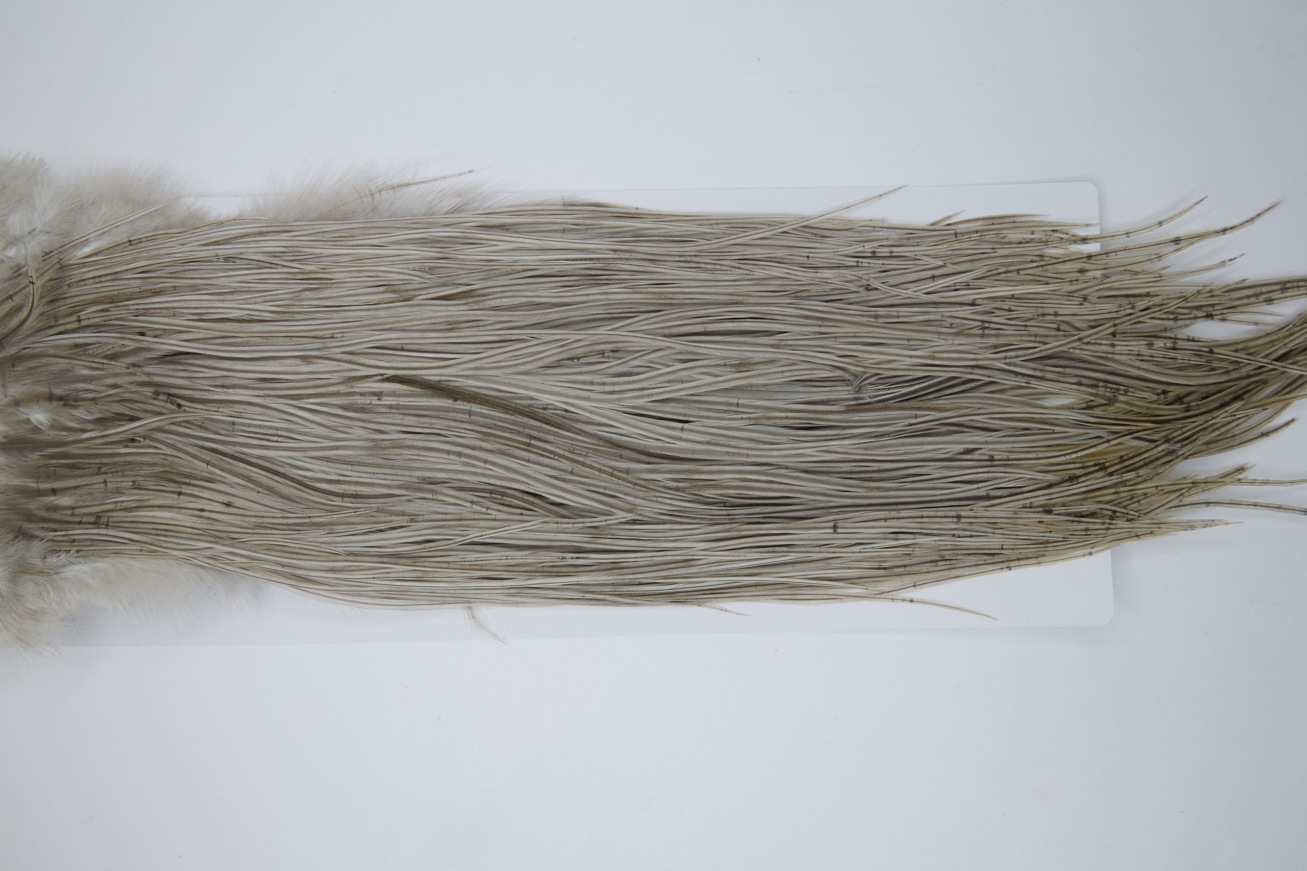 12007 is a Hebert Minor Silver Grade Rooster Saddle of Light Grey Dun color that ties predominately size 12-14. The image shown is an actual photo of this dry fly saddle. This is NEW UNUSED HACKLE.