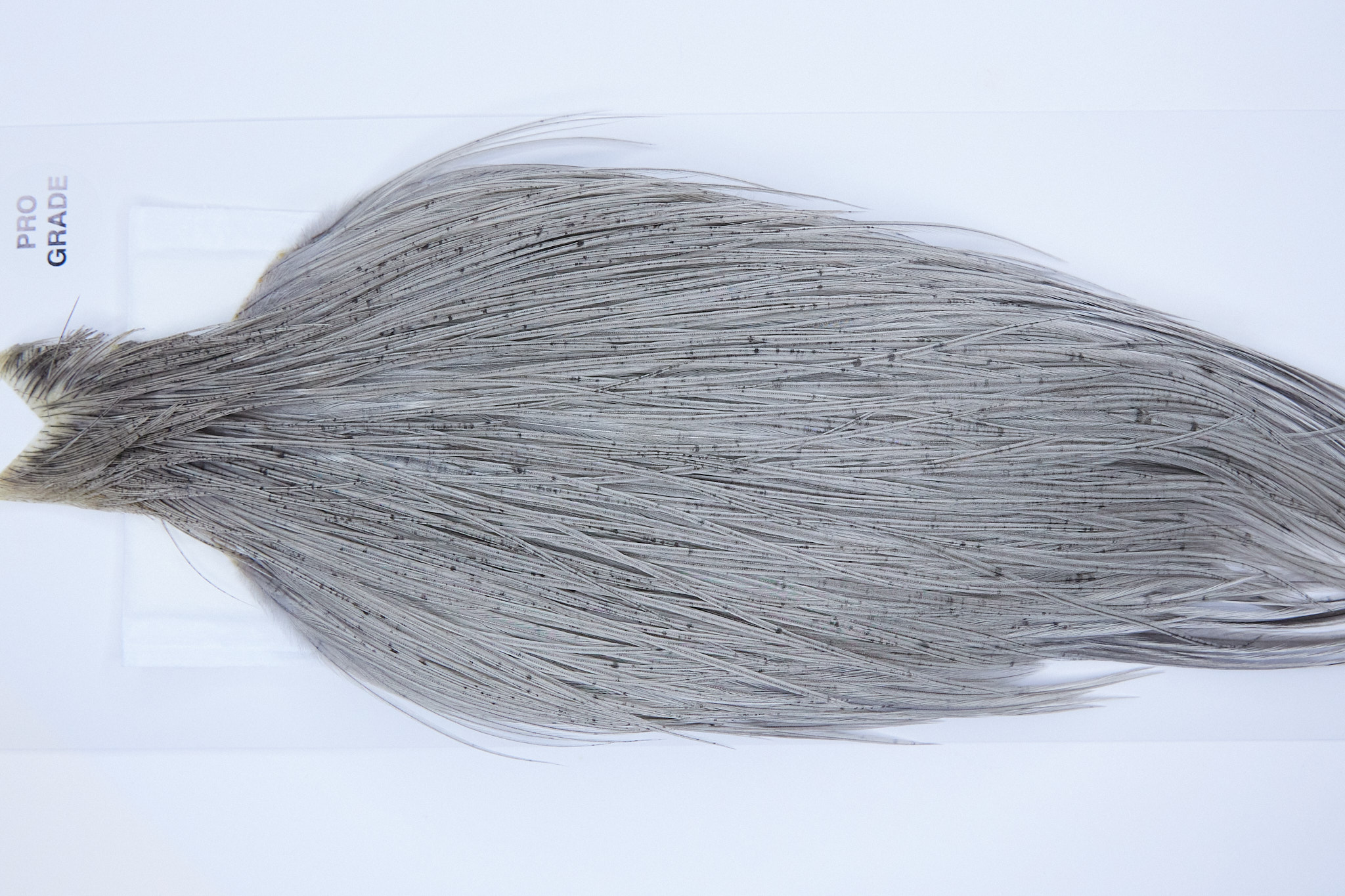 1201 Heber Miner Pro Grade Rooster Cape of a Light Grey Dun color. This dry fly hackle ties predominately sizes 8-22. The photos shown are the actual photos of this dry fly Rooster Cape.