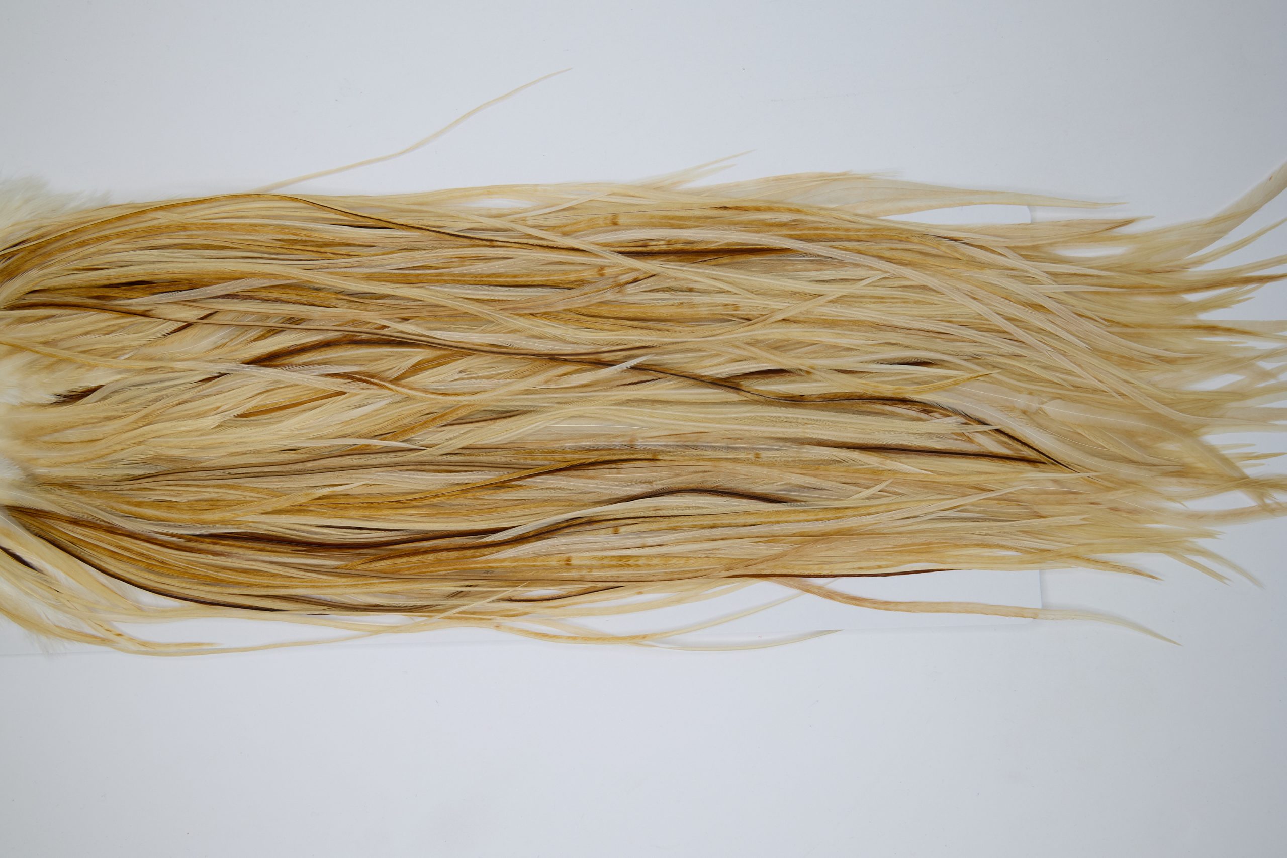 12016 is a Hebert Minor Silver Grade Rooster Saddle of Light Ginger color that ties predominately size 14-16. The image shown is an actual photo of this dry fly saddle. This is NEW UNUSED HACKLE.