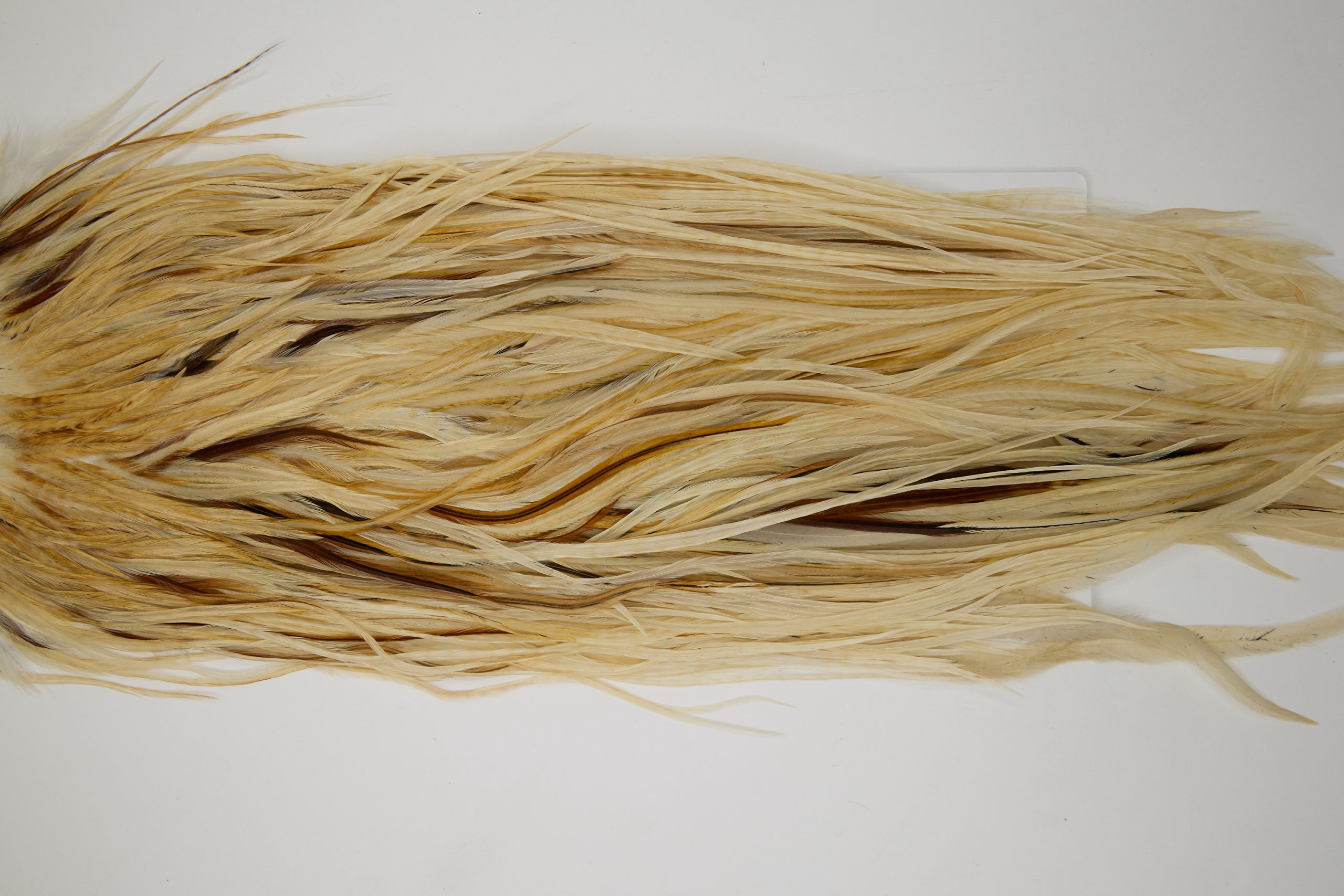 12048 is a Hebert Minor Bronze Grade Rooster Saddle of Light Ginger color that ties predominately size 12-14. The image shown is an actual photo of this dry fly saddle. This is NEW UNUSED HACKLE.