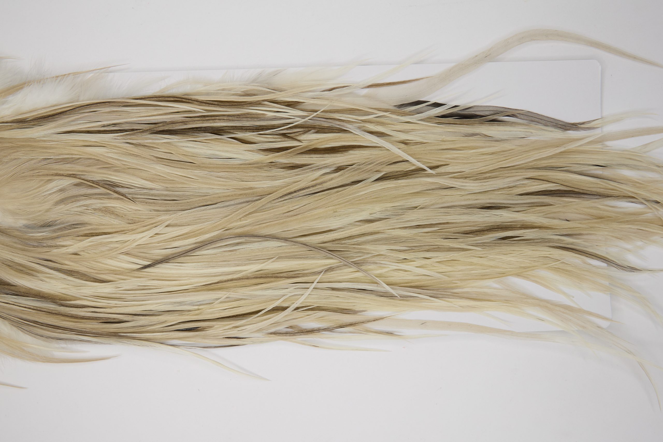 12055 is a Hebert Minor Bronze Grade Rooster Saddle of Pale Watery Dun color that ties predominately size 12-14. The image shown is an actual photo of this dry fly saddle. This is NEW UNUSED HACKLE.