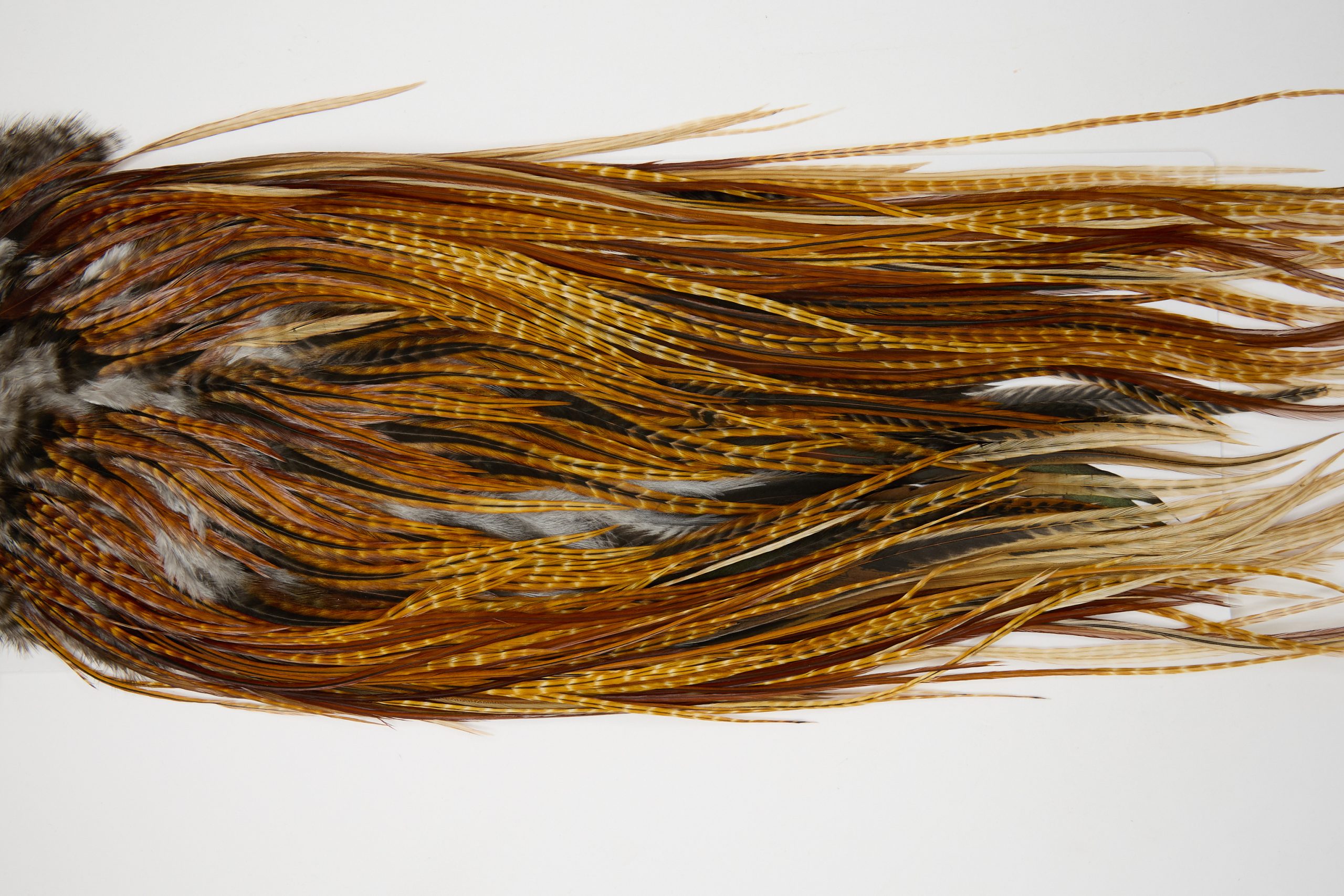 12073 is a Hebert Minor Pro Grade Rooster Saddle of Barred Dark Ginger color that ties predominately size 12-16. The image shown is an actual photo of this dry fly saddle. This is NEW UNUSED HACKLE.