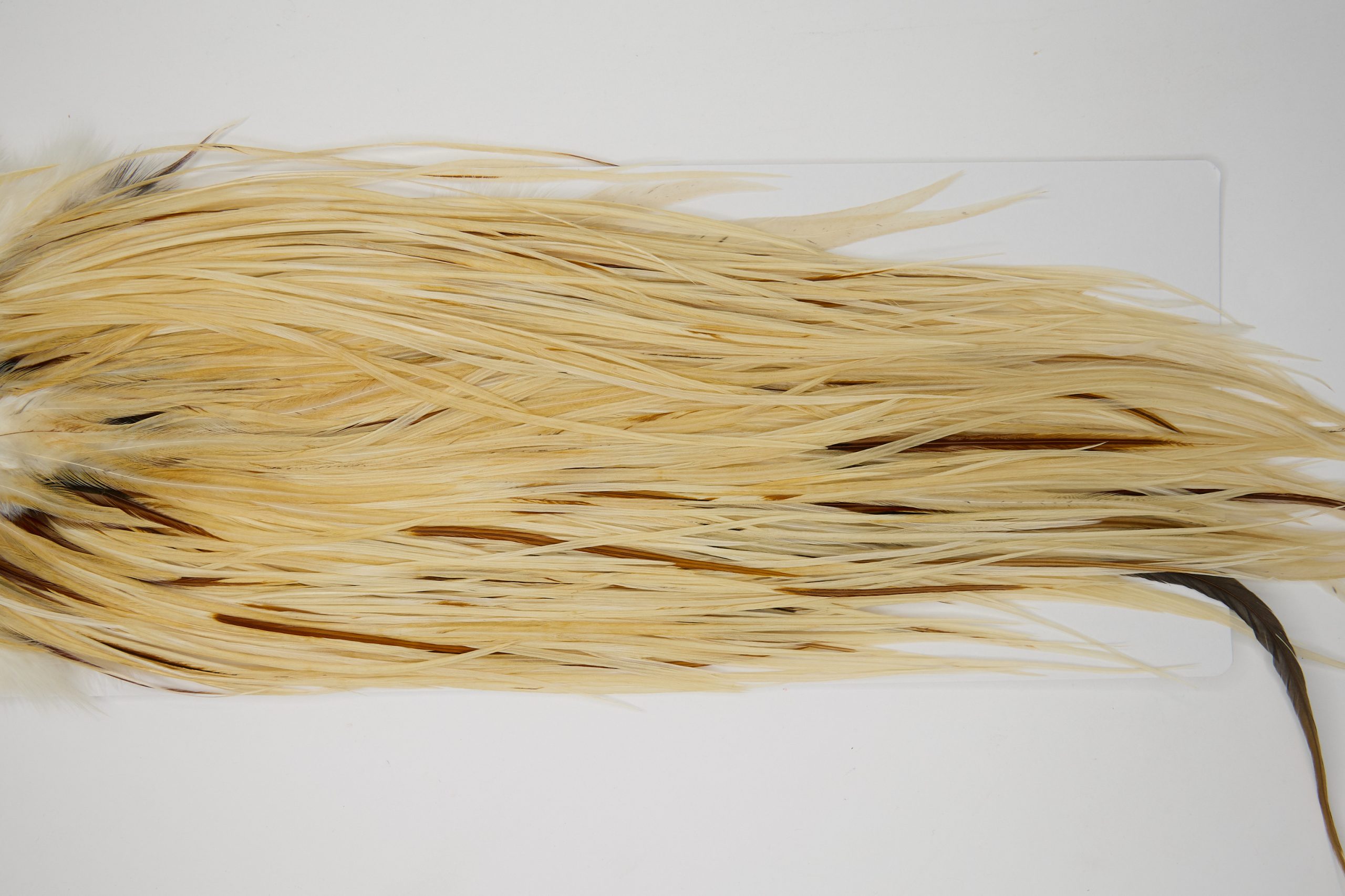 12098 is a Hebert Minor Pro Grade Rooster Saddle of Light Ginger color that ties predominately size 14-18. The image shown is an actual photo of this dry fly saddle. This is NEW UNUSED HACKLE.