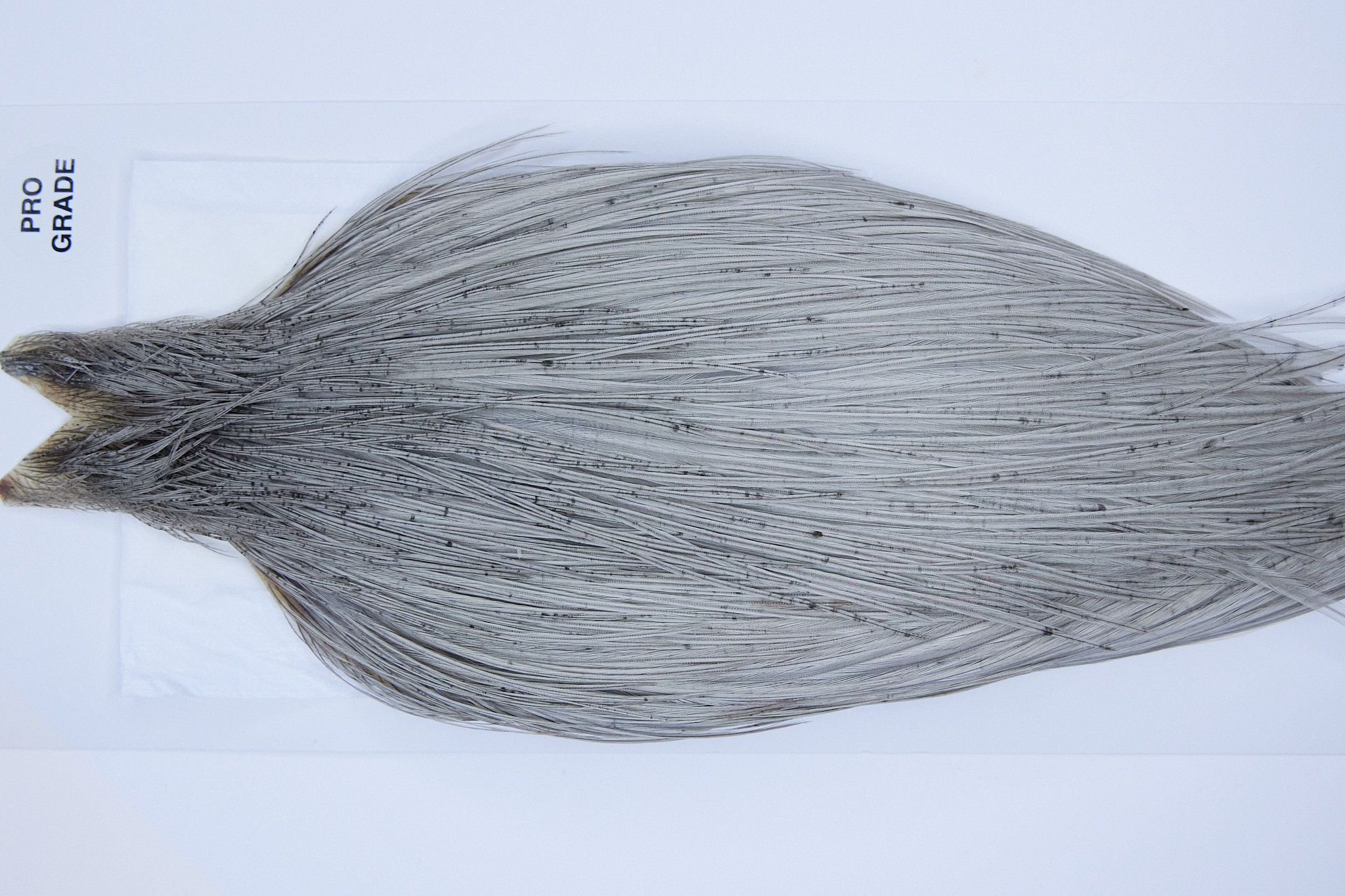 1212 Heber Miner Pro Grade Rooster Cape of a Light Grey Dun color. This dry fly hackle ties predominately sizes 10-22. The photos shown are the actual photos of this dry fly Rooster Cape.