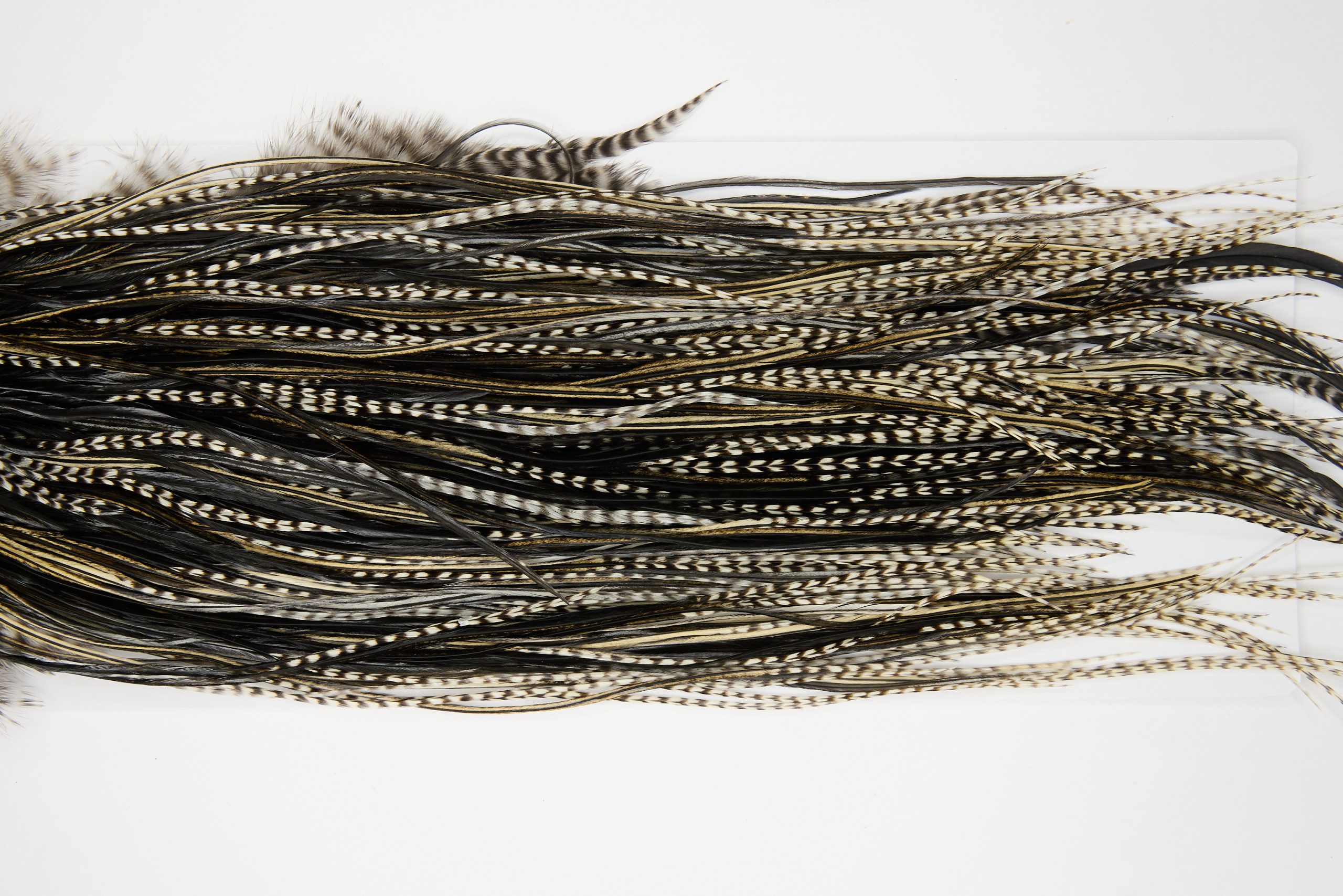 12120 is a Hebert Minor Pro Grade Rooster Saddle of Grizzly Variant color that ties predominately size 12-18. The image shown is an actual photo of this dry fly saddle. This is NEW UNUSED HACKLE.