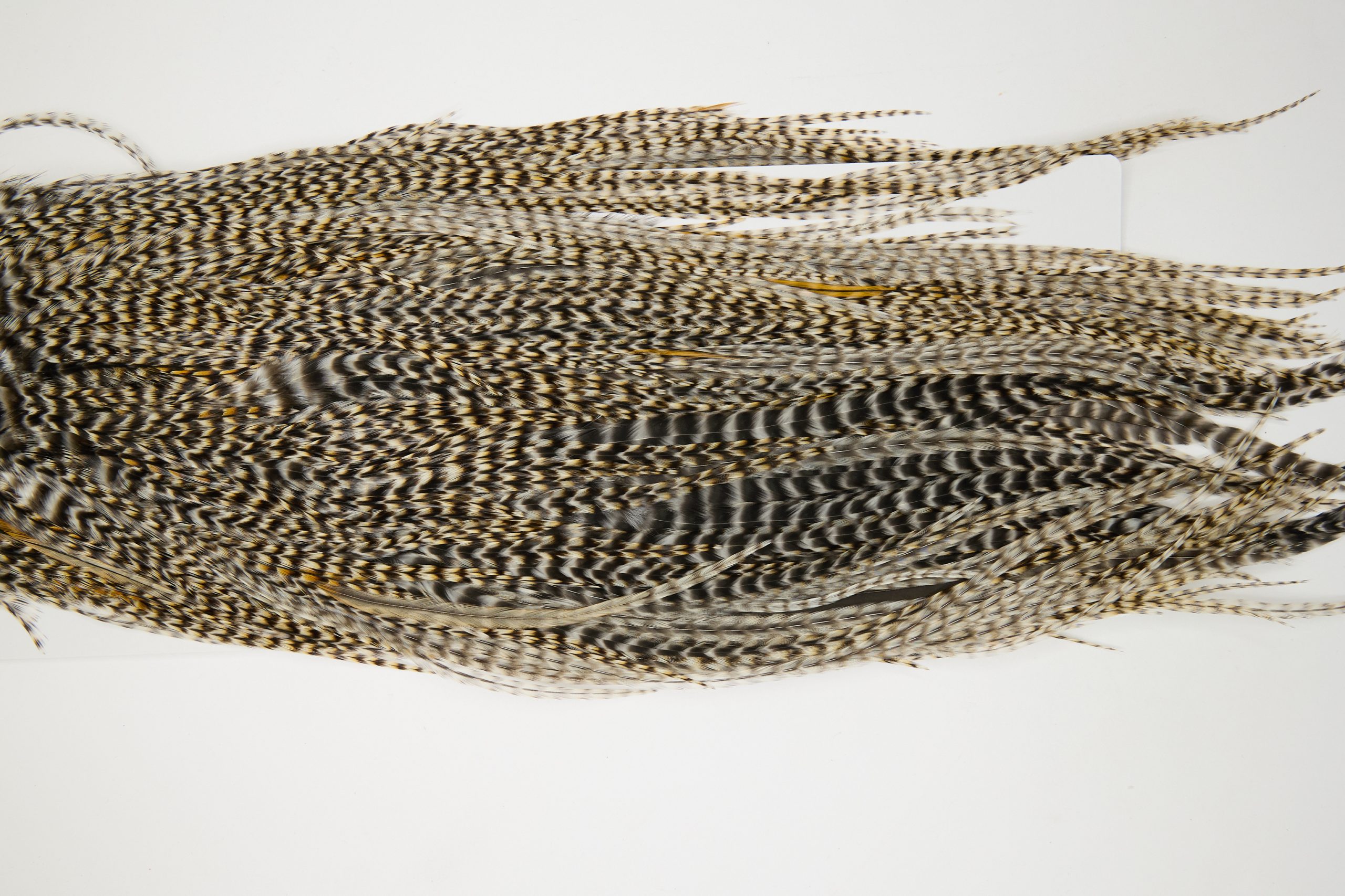 12122 is a Hebert Minor Pro Grade Rooster Saddle of Grizzly Variant color that ties predominately size 12-16. The image shown is an actual photo of this dry fly saddle. This is NEW UNUSED HACKLE.