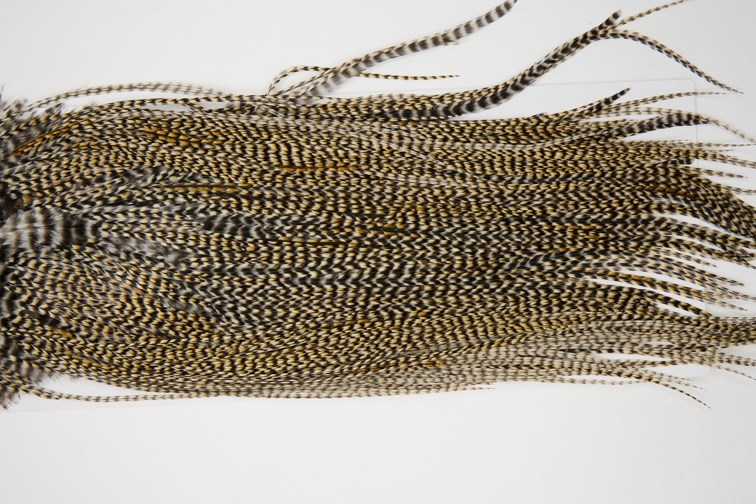 12123 is a Hebert Minor Pro Grade Rooster Saddle of Grizzly Variant color that ties predominately size 12-18. The image shown is an actual photo of this dry fly saddle. This is NEW UNUSED HACKLE.