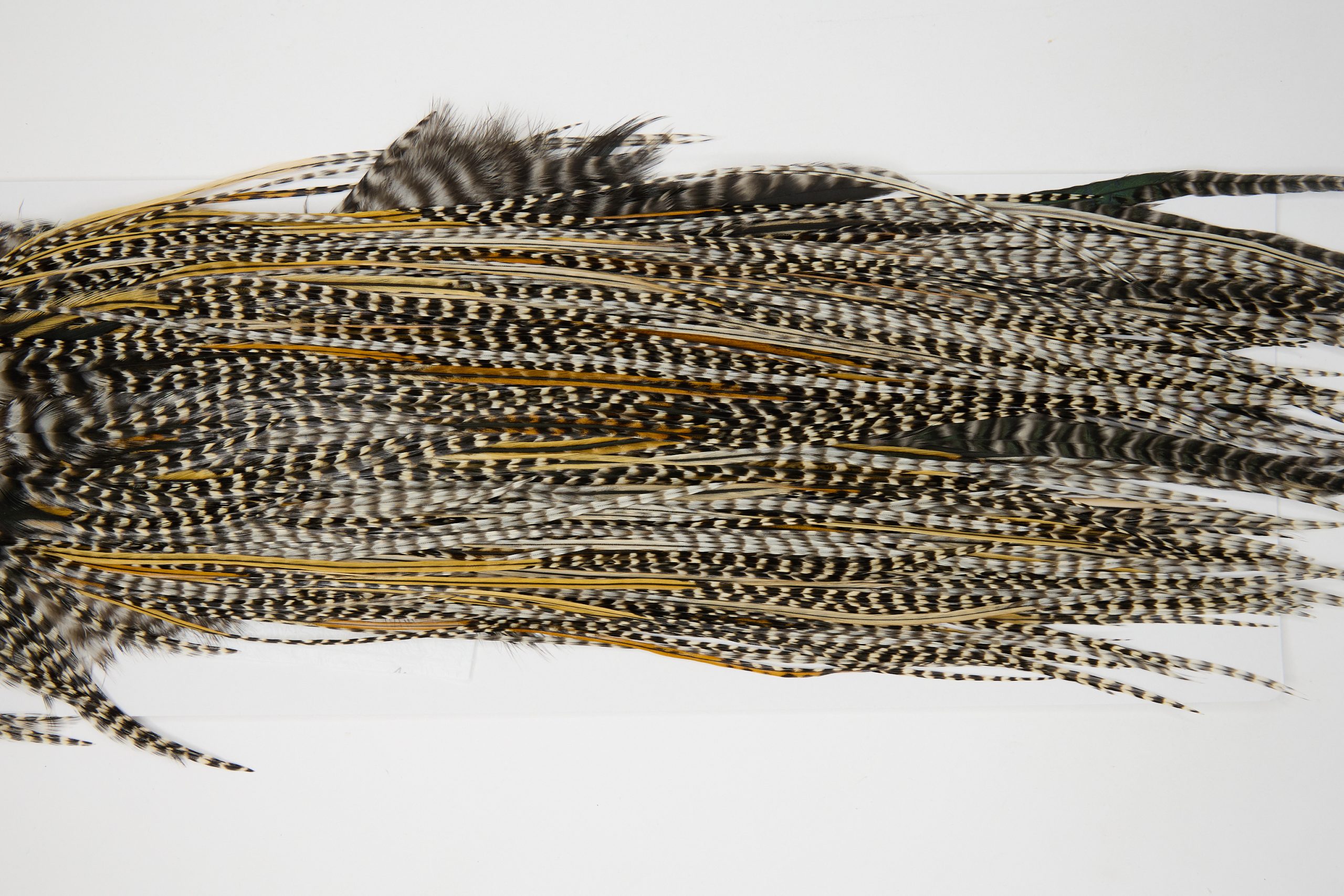12127 is a Hebert Minor Pro Grade Rooster Saddle of Grizzly Variant color that ties predominately size 12-14. The image shown is an actual photo of this dry fly saddle. This is NEW UNUSED HACKLE.