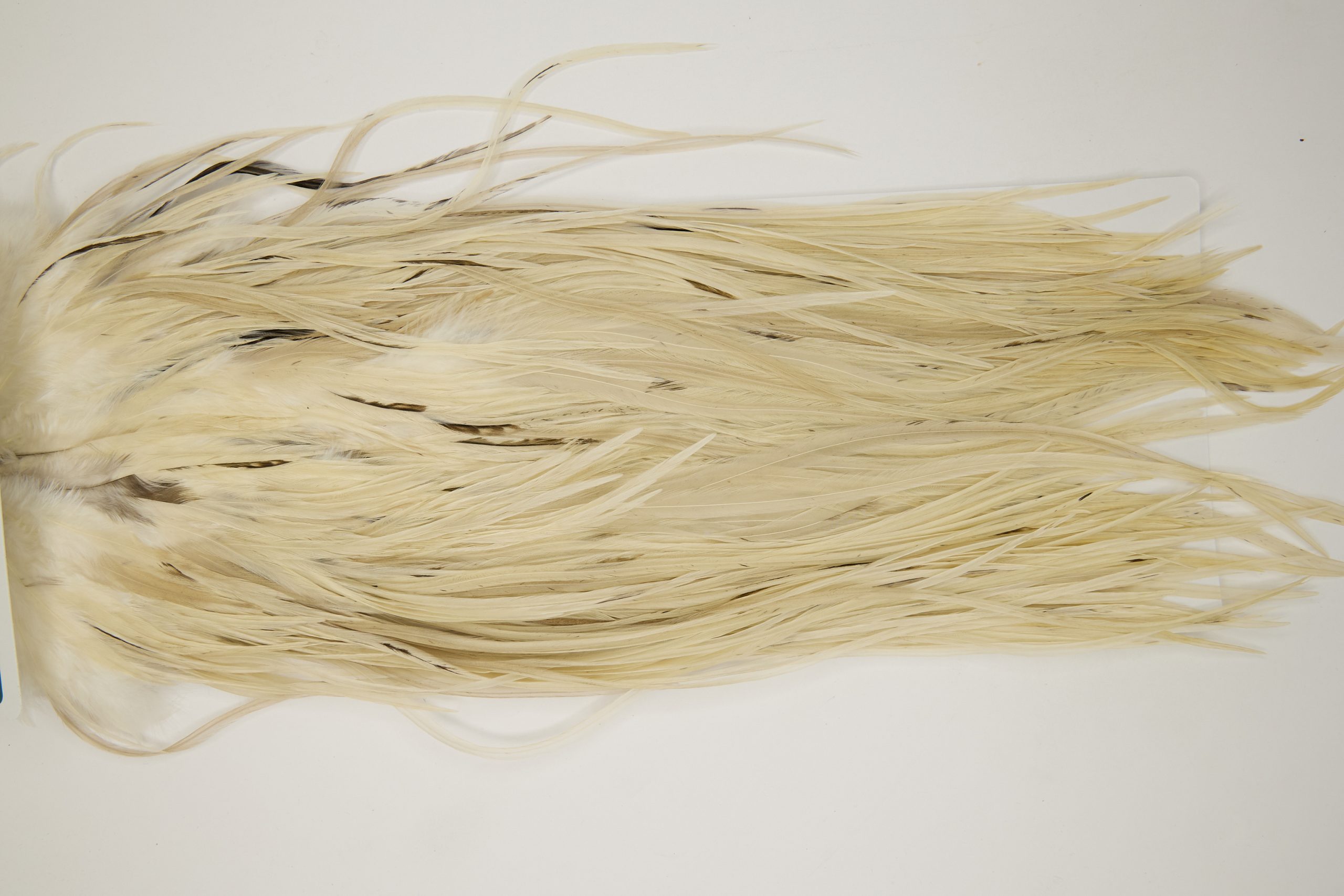 12138 is a Hebert Minor Pro Grade Rooster Saddle of Grizzly Variant color that ties predominately size 10-14. The image shown is an actual photo of this dry fly saddle. This is NEW UNUSED HACKLE.
