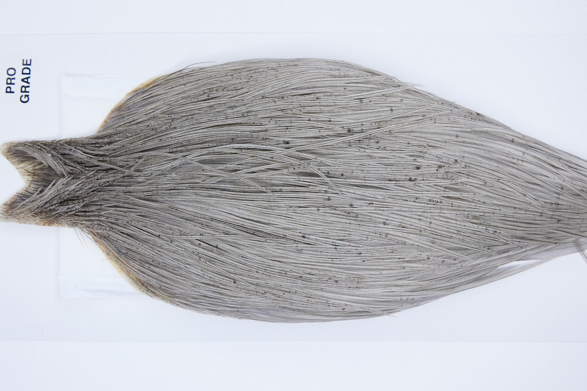 1215 Heber Miner Pro Grade Rooster Cape of a Light Grey Dun color. This dry fly hackle ties predominately sizes 8-20. The photo shown is an actual photo of this hackle.