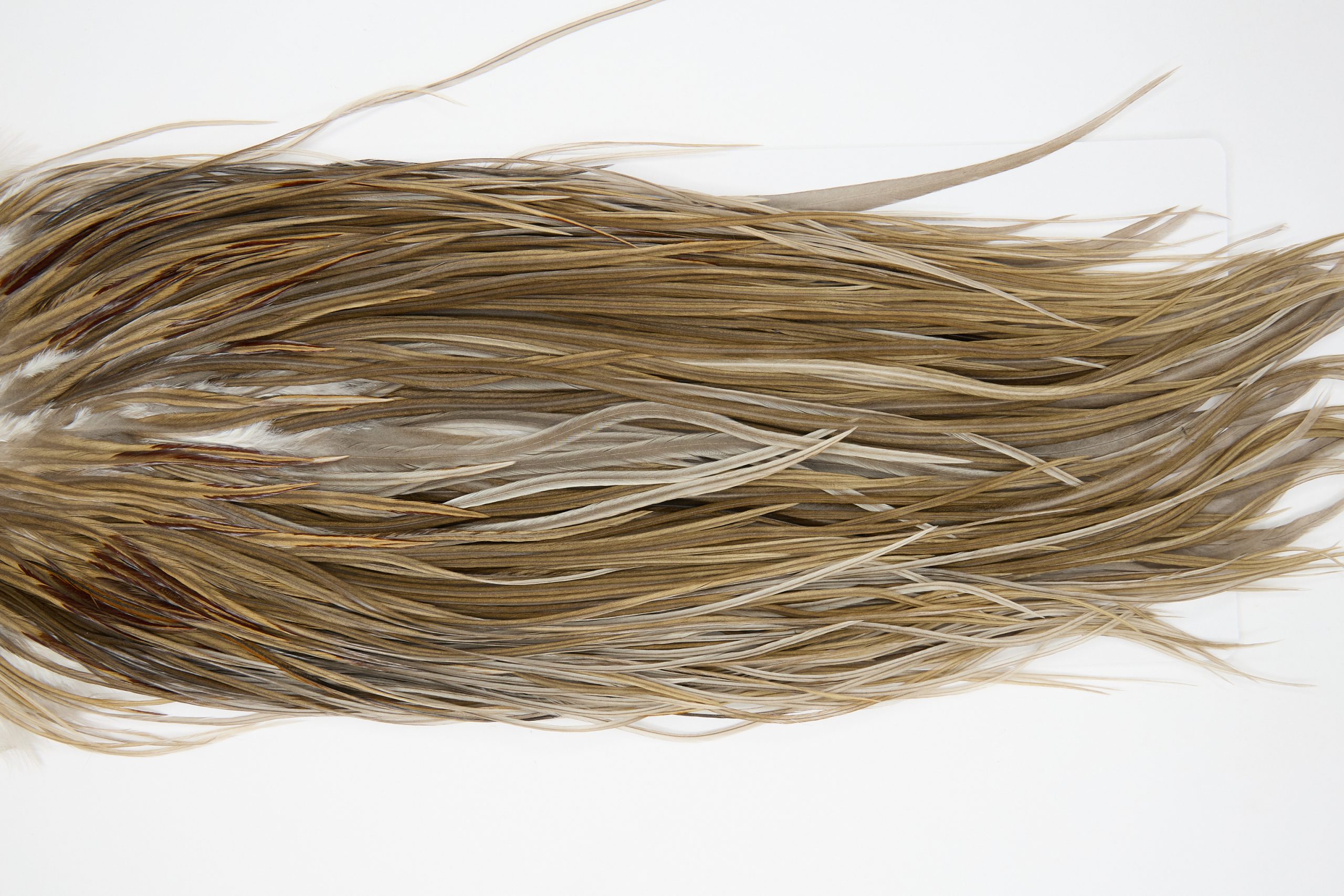 12200 is a Hebert Minor Pro Grade Rooster Saddle of Brown Grey Dun color that ties predominately size 14-18. The image shown is an actual photo of this dry fly saddle. This is NEW UNUSED HACKLE.