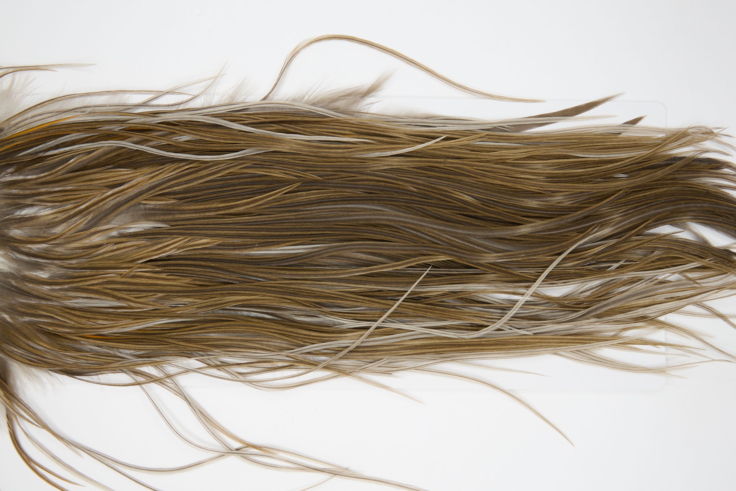 12203 is a Hebert Minor Pro Grade Rooster Saddle of Brown Grey Dun color that ties predominately size 12-16. The image shown is an actual photo of this dry fly saddle. This is NEW UNUSED HACKLE.