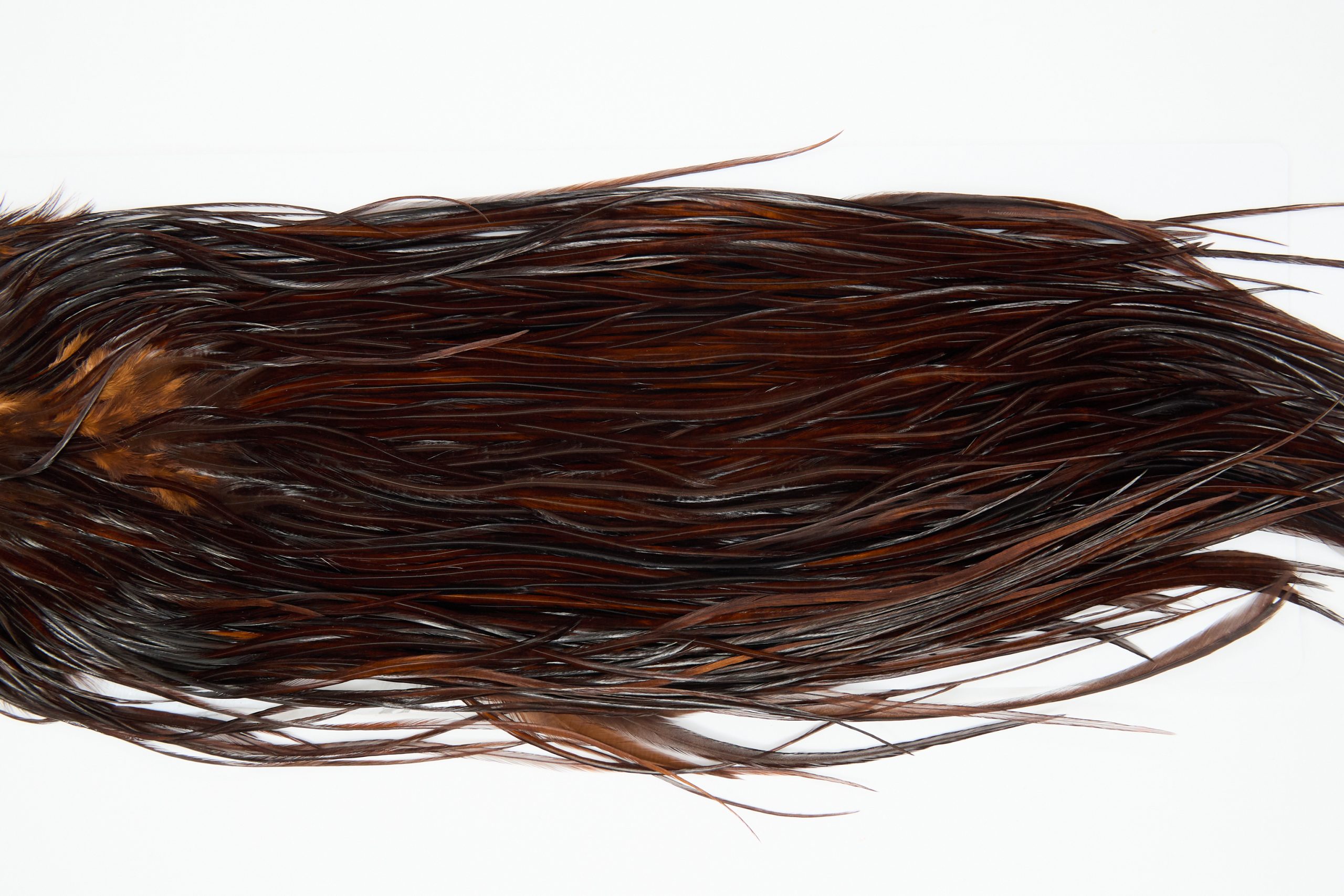 12207 is a Hebert Minor Bronze Grade Rooster Saddle of Coachman Brown color that ties predominately size 12-16. The image shown is an actual photo of this dry fly saddle. This is NEW UNUSED HACKLE.