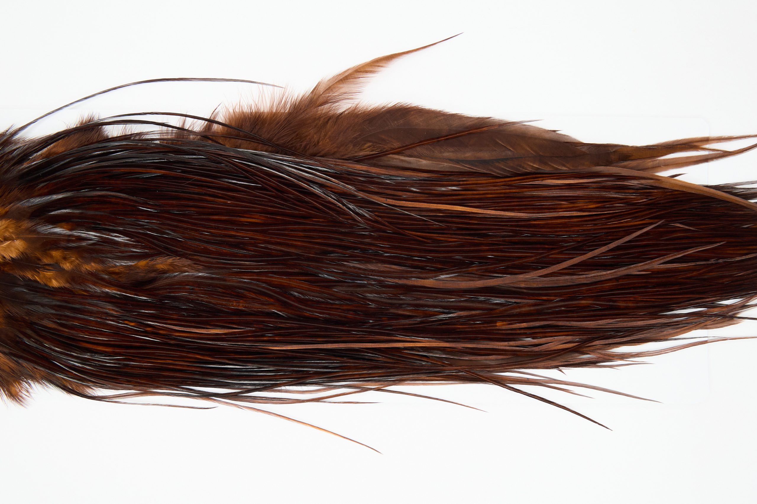 12210 is a Hebert Minor Bronze Grade Rooster Saddle of Coachman Brown color that ties predominately size 14-16. The image shown is an actual photo of this dry fly saddle. This is NEW UNUSED HACKLE.