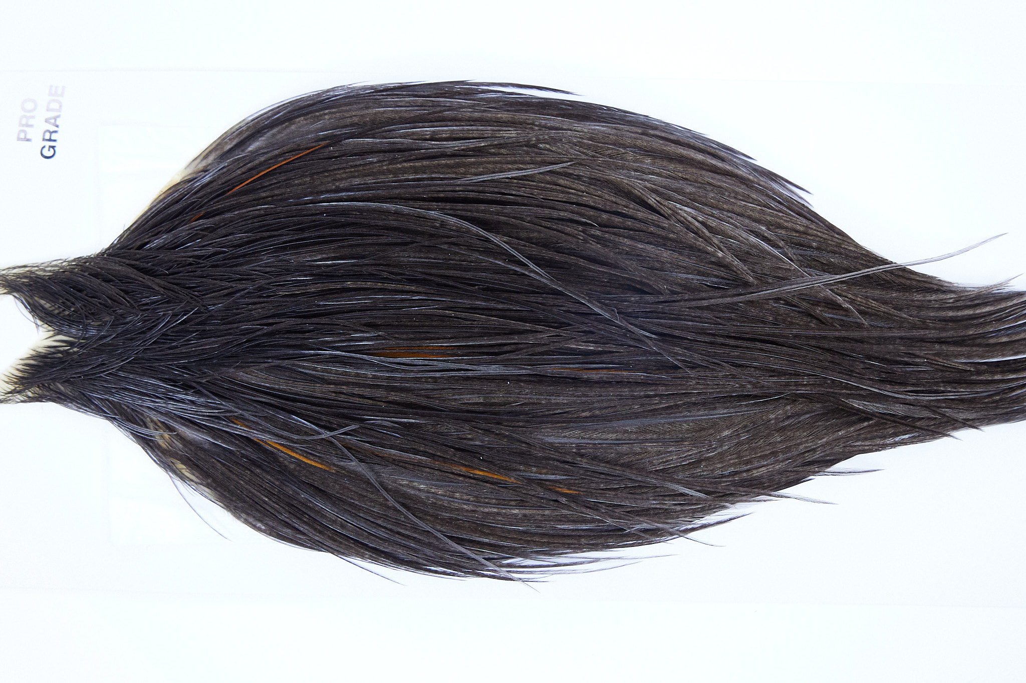 1223 Heber Miner Pro Grade Rooster Cape of a Black color. This dry fly hackle ties predominately sizes 10-24. The photos shown are the actual photos of this dry fly Rooster Cape.