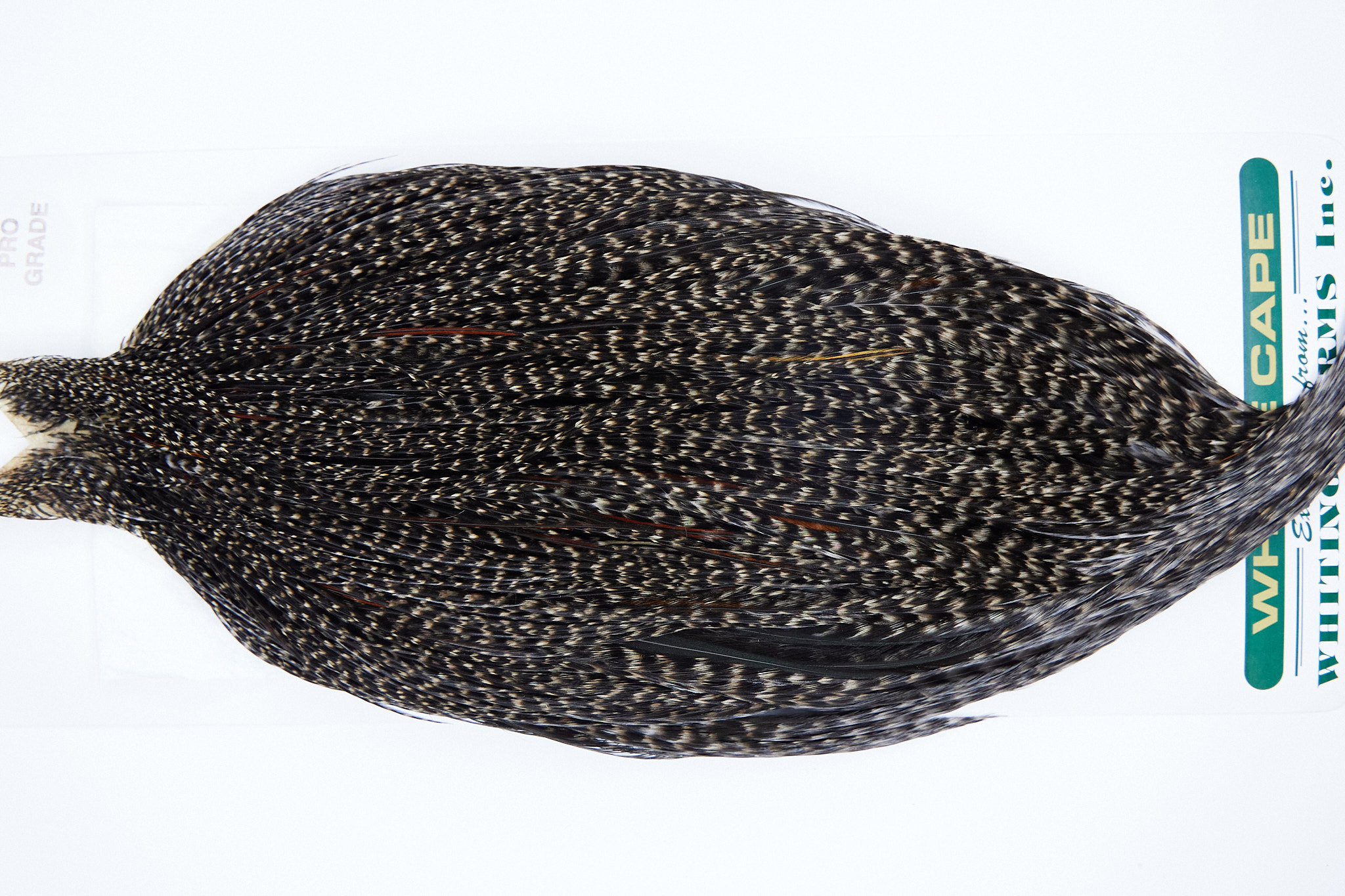 1229 Heber Miner Pro Grade Rooster Cape of a Grizzly Variant color. This dry fly hackle ties predominately sizes 10-22. The photo shown is an actual photo of this hackle.