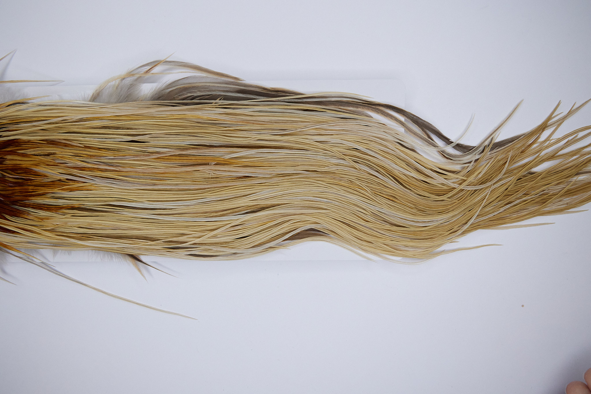 1322 Heber Miner Silver Grade Rooster Saddle of a Light Ginger color. This dry fly hackle ties predominately sizes 14-16. The photo shown is an actual photo of this hackle.