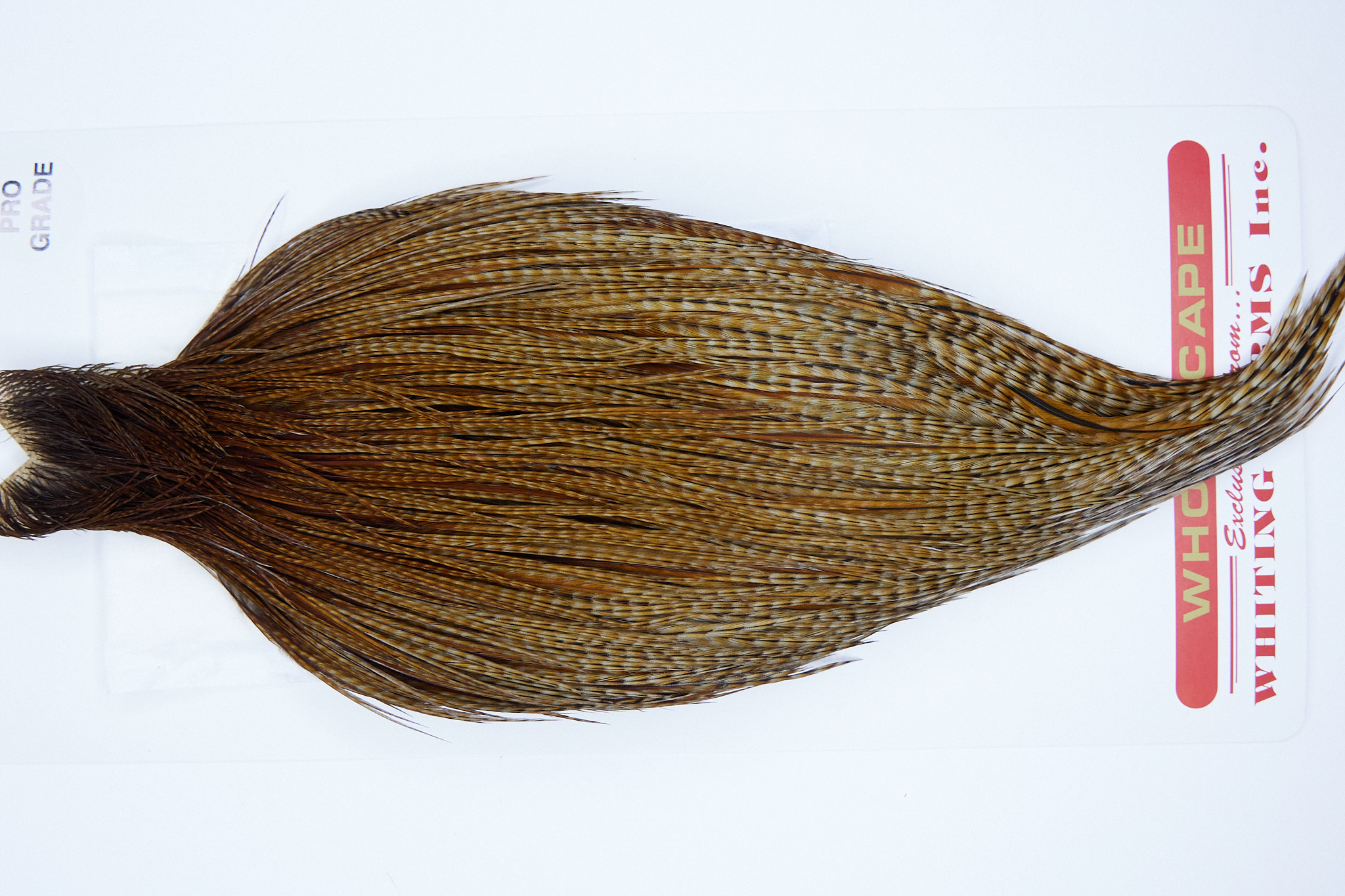 1516 Whiting Pro Grade Rooster Cape of a Variant color. This dry fly hackle ties predominately sizes 8-22. The image shown is an actual photo of this hackle.