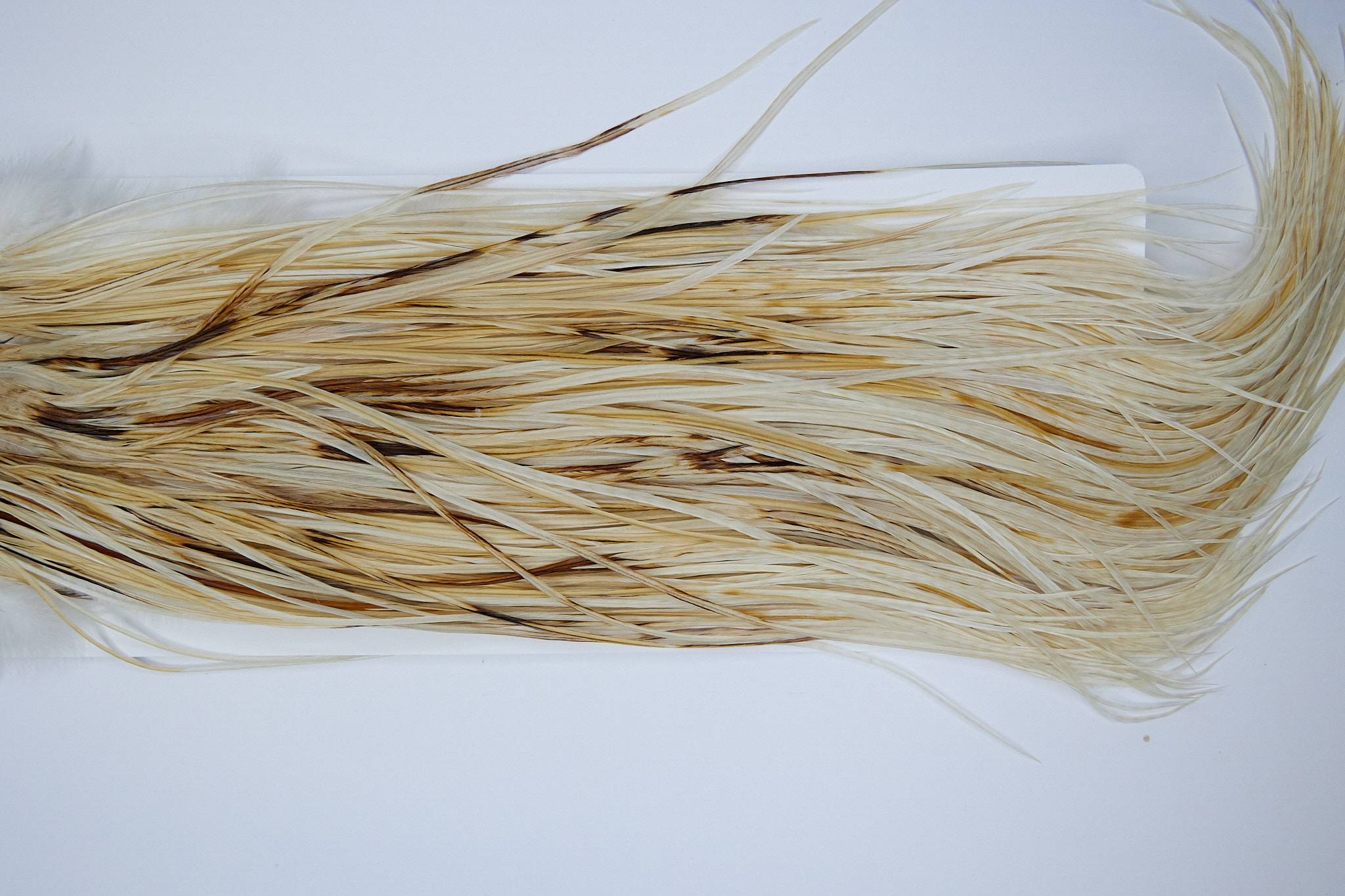 1547 Whiting Gold Grade Rooster Saddle of a Variant color. This dry fly hackle ties predominately sizes 14-16. The image shown is an actual photo of this hackle.