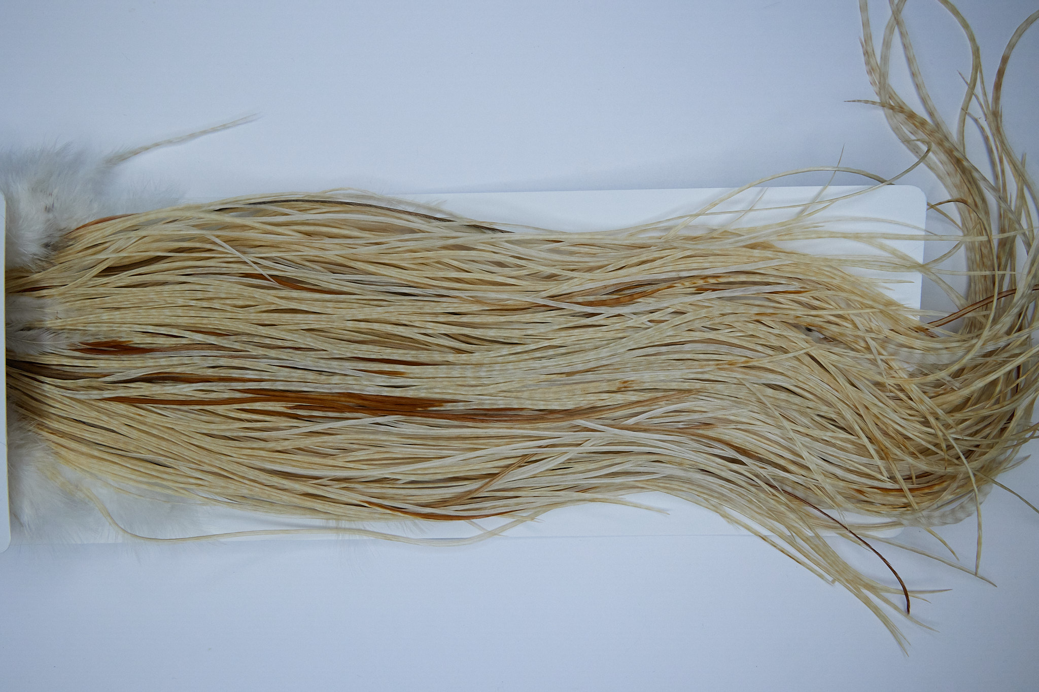 1563 Whiting Silver Grade Rooster Saddle of a Variant color. This dry fly hackle ties predominately sizes 14-16. The image shown is an actual photo of this hackle.