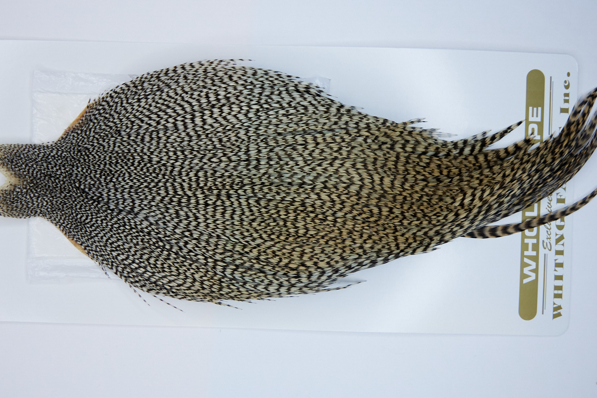 1719 is a Heritage 1 Grade Rooster Cape of Grizzly Variant color that ties predominately size 8-22. The image shown is an actual photo of this dry fly cape. This is NEW UNUSED HACKLE.