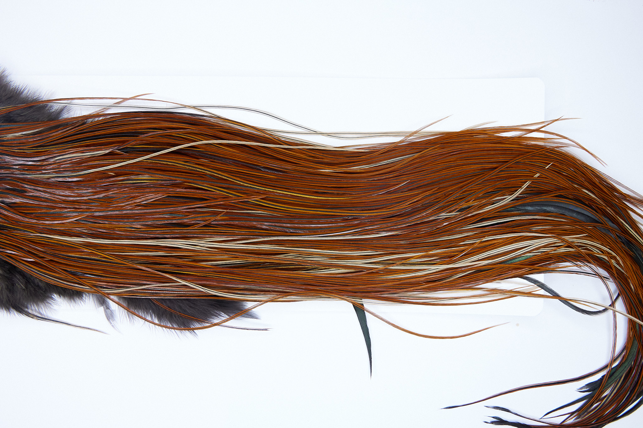 1825 is a Heritage 1 Grade Rooster Saddle of Furnace color that ties predominately size 14-16. The image shown is an actual photo of this dry fly saddle. This is NEW UNUSED HACKLE.