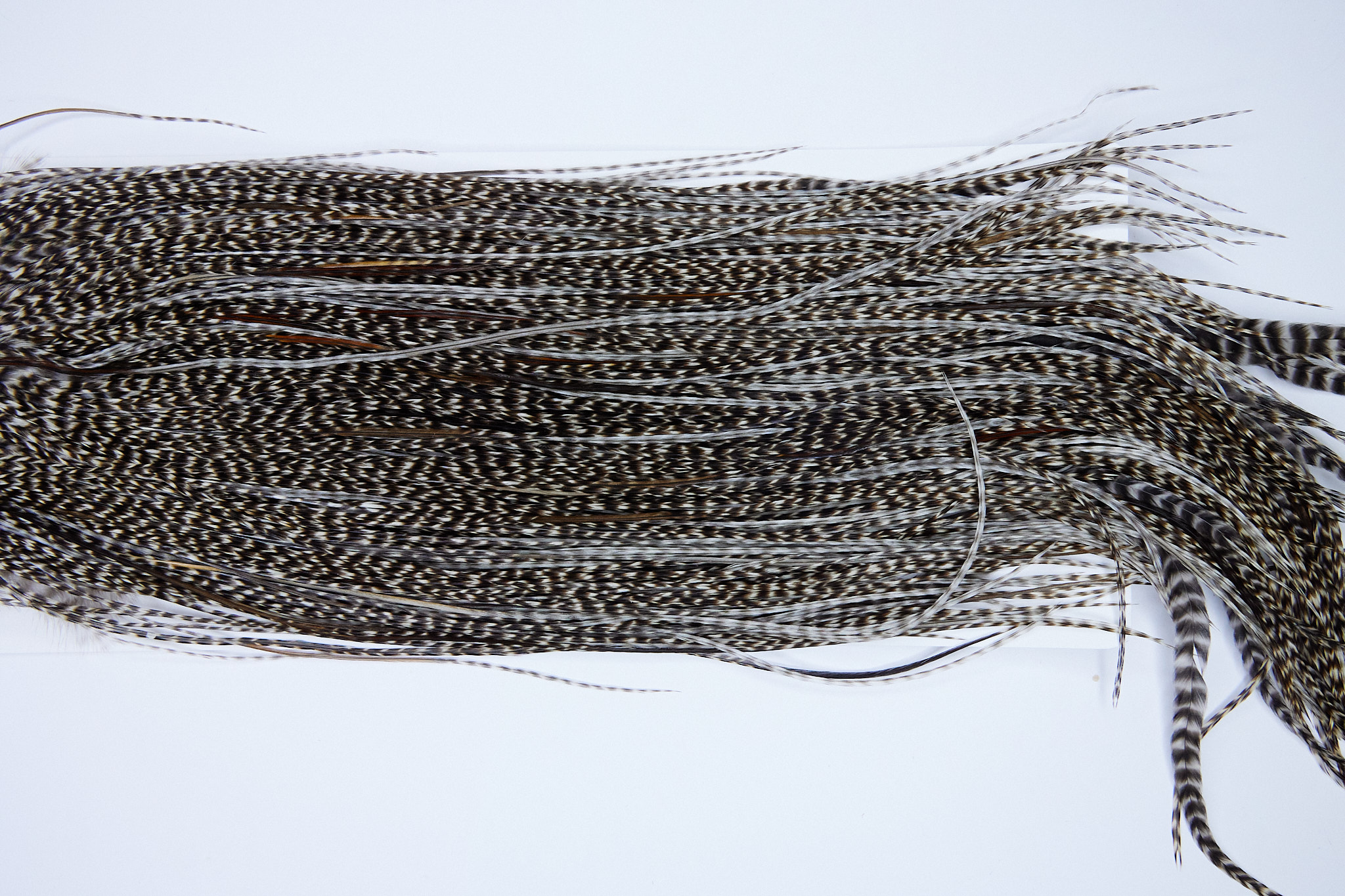 1832 is a Heritage 1 Grade Rooster Saddle of Grizzly Variant color that ties predominately size 14-16. The image shown is an actual photo of this dry fly saddle. This is NEW UNUSED HACKLE.