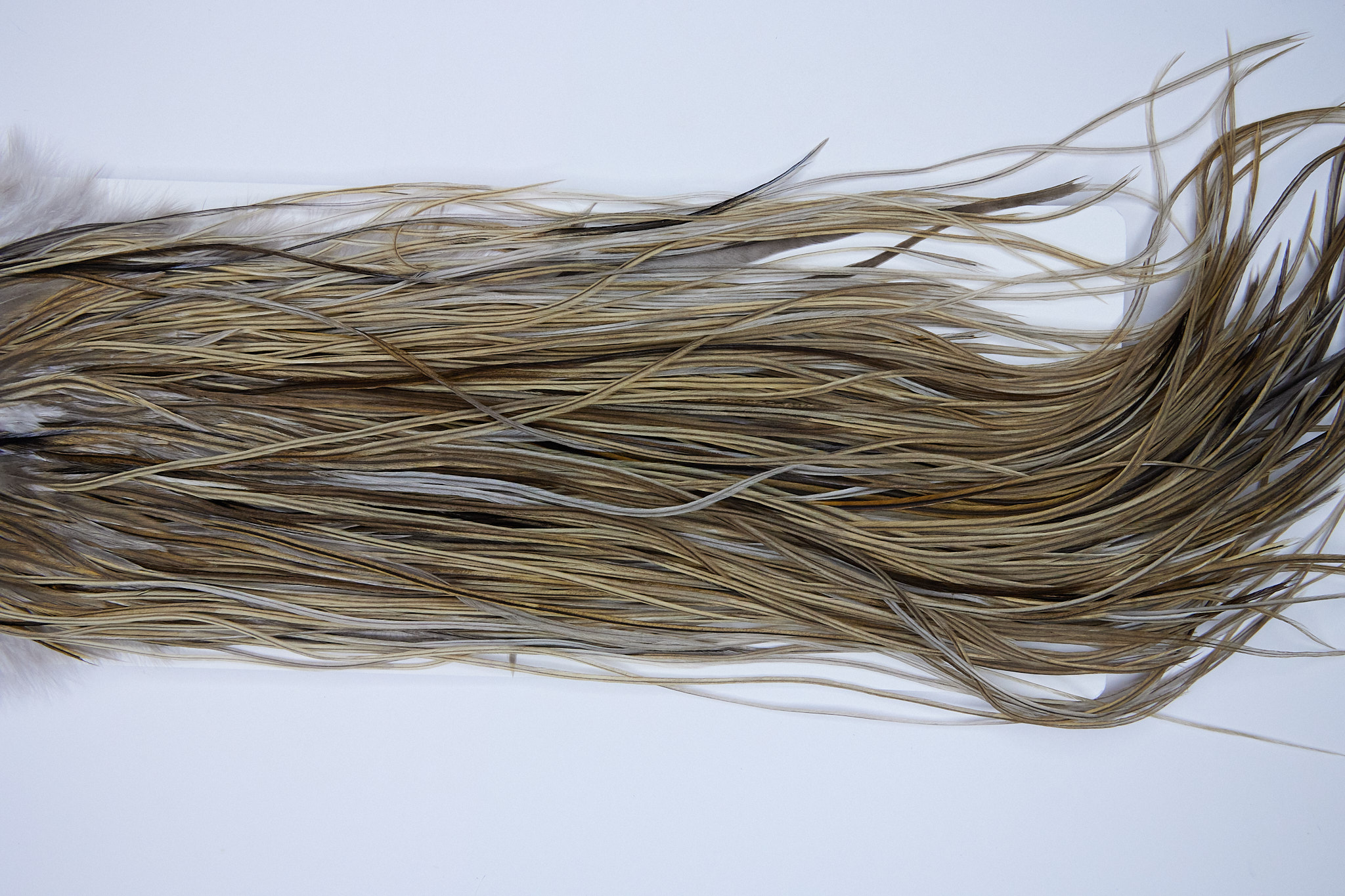 1857 is a Heritage 2 Grade Rooster Saddle of Heritage Vermiculated Badger color that ties predominately size 14-16. The image shown is an actual photo of this dry fly saddle. This is NEW UNUSED HACKLE.