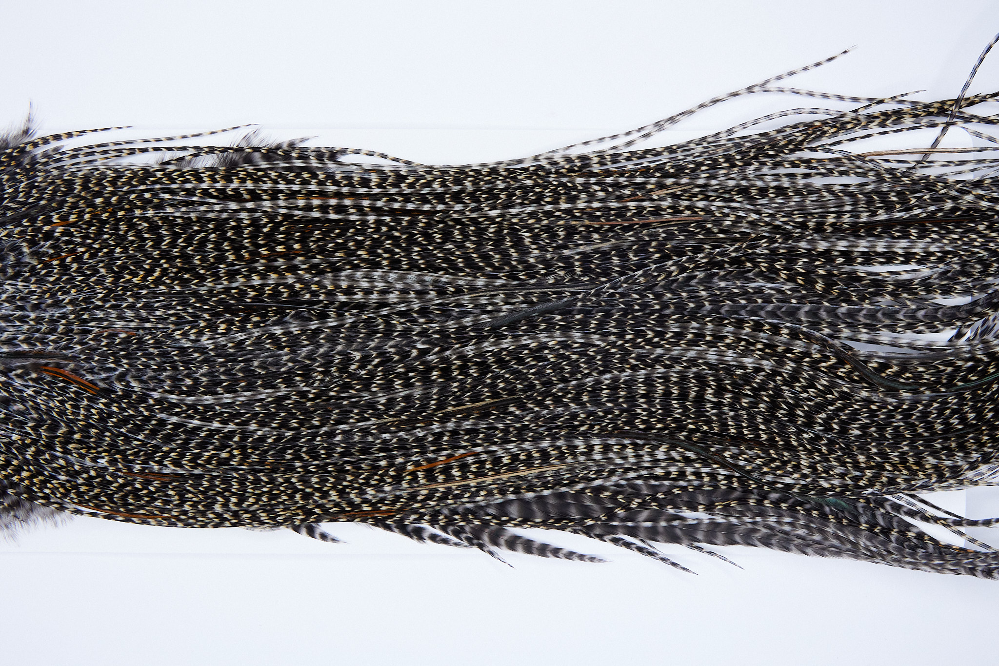 1950 is a Heritage 2 Grade Rooster Saddle of Grizzly Variant color that ties predominately size 14-16. The image shown is an actual photo of this dry fly saddle. This is NEW UNUSED HACKLE.