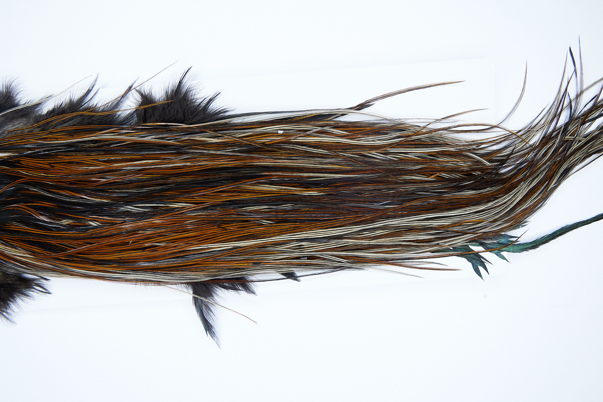 2009 is a Heritage 3 Grade Rooster Saddle of Furnace color that ties predominately size 14-16. The image shown is an actual photo of this dry fly saddle. This is NEW UNUSED HACKLE.