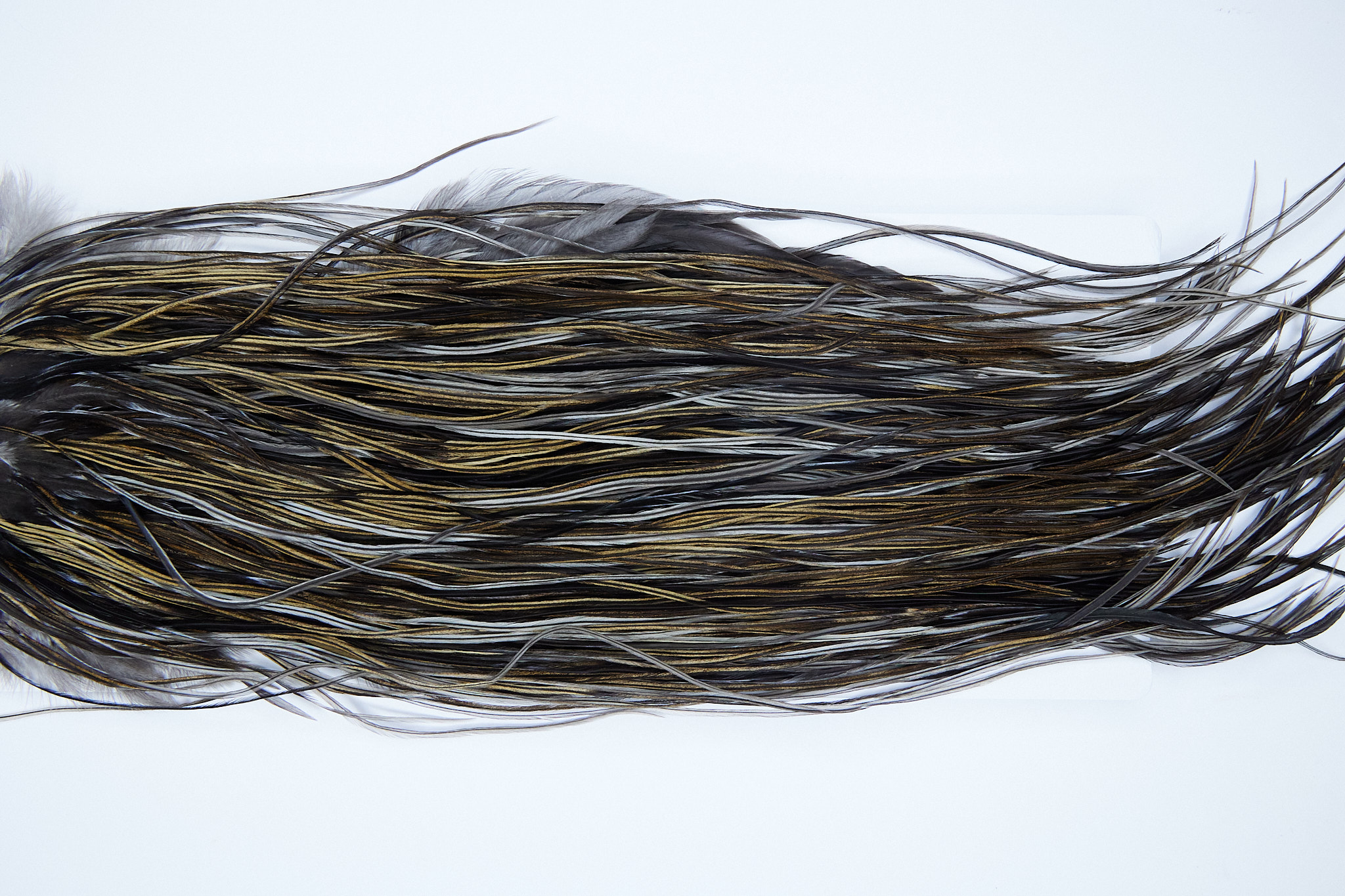 2044 is a Heritage 3 Grade Rooster Saddle of Heritage Vermiculated Badger color that ties predominately size 14-16. The image shown is an actual photo of this dry fly saddle. This is NEW UNUSED HACKLE.