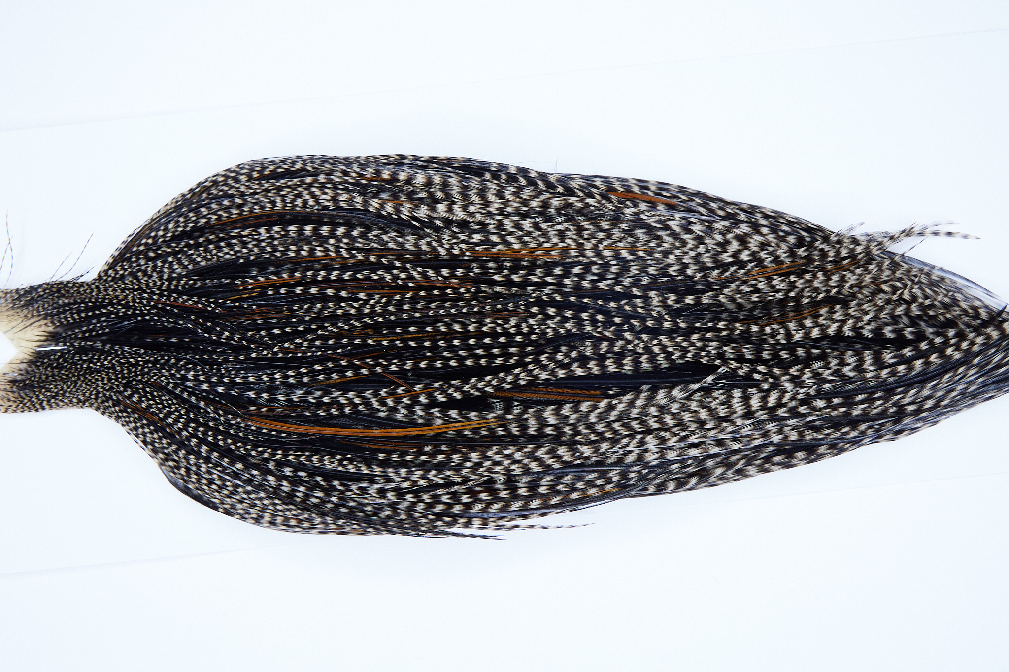 2352is a Yellowstone 1 Grade Rooster Cape of Grizzly Variant color that ties predominately size 10-22. The image shown is an actual photo of this dry fly cape. This is NEW UNUSED HACKLE.