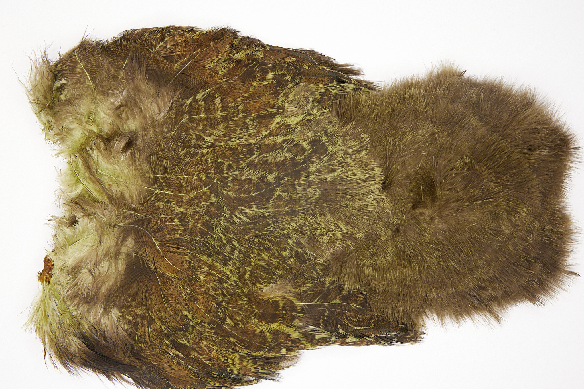 2518 is a Coq De Leon Rooster Cape of Chickabou Olive color. The image shown is an actual photo of this dry fly saddle. This is NEW UNUSED HACKLE.
