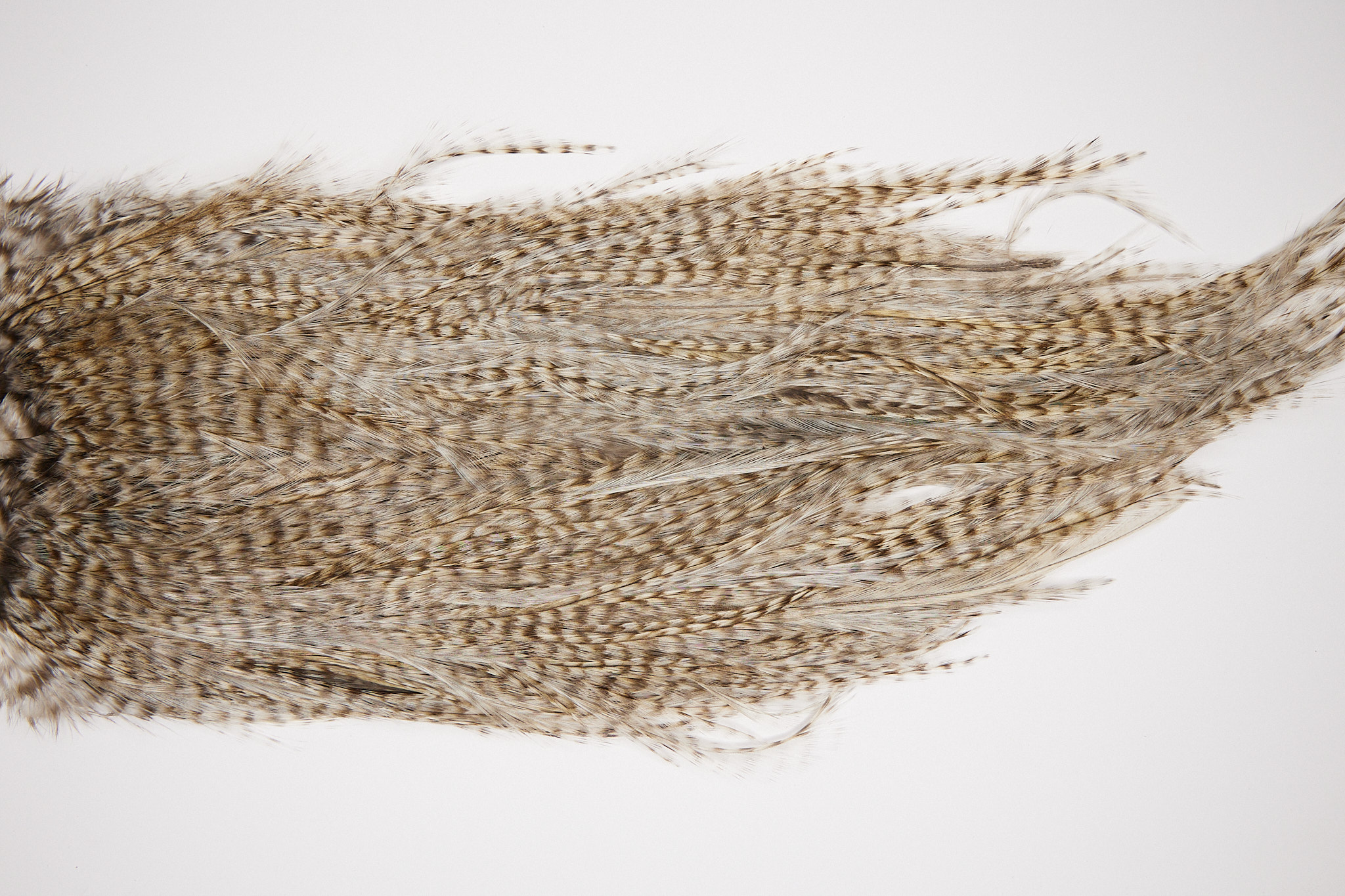2562 is a Coq De Leon Rooster Saddle of Grizzly color. The image shown is an actual photo of this dry fly saddle. This is NEW UNUSED HACKLE.