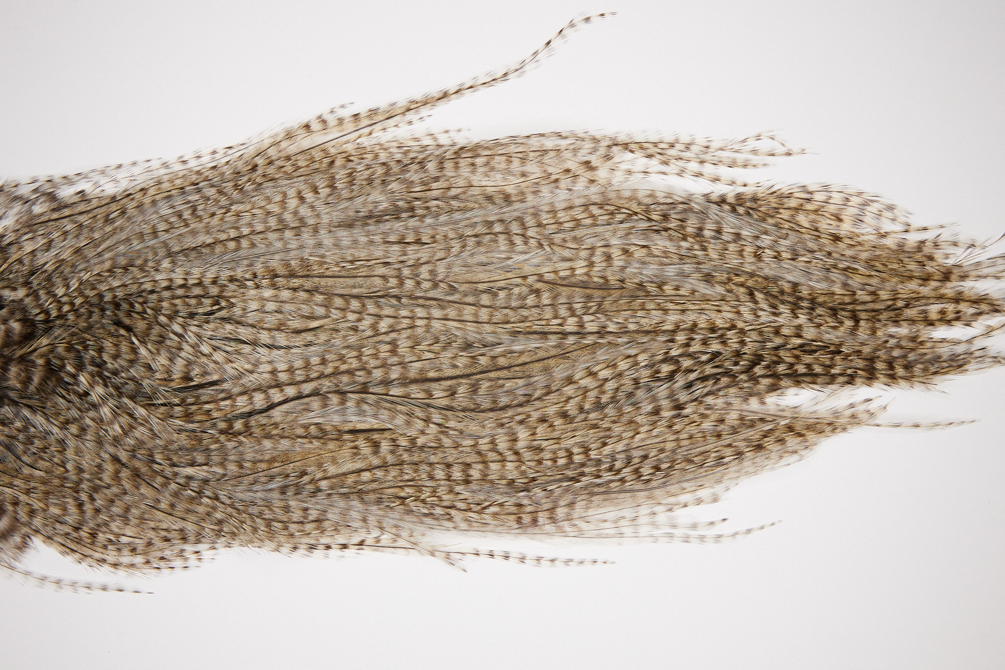 2565 is a Coq De Leon Rooster Saddle of Grizzly color. The image shown is an actual photo of this dry fly saddle. This is NEW UNUSED HACKLE.