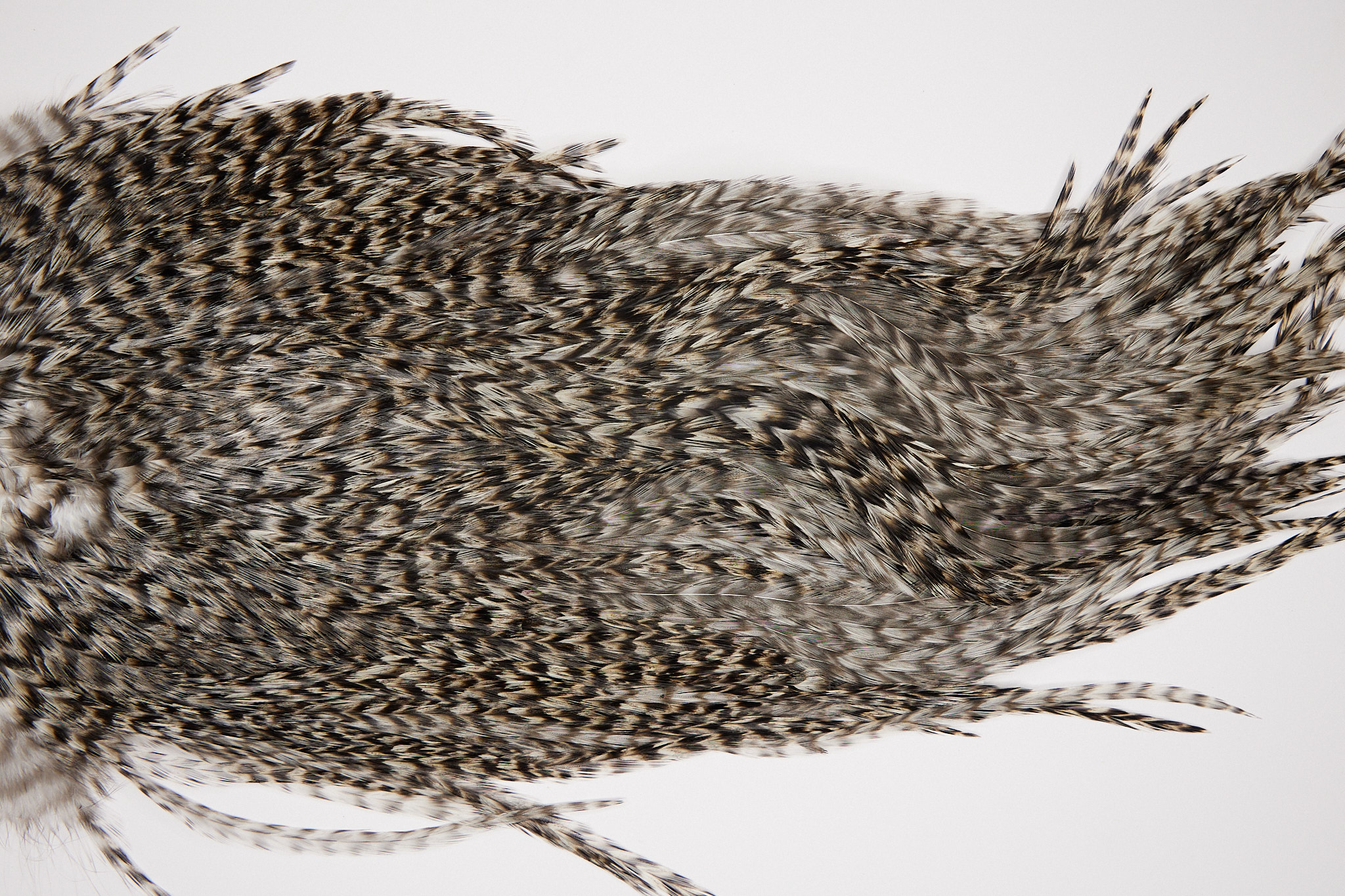 2570 is a Coq De Leon Gold Grade Rooster Cape of CDL Grizzly color that ties predominately size 4-6. The image shown is an actual photo of this dry fly saddle. This is NEW UNUSED HACKLE.