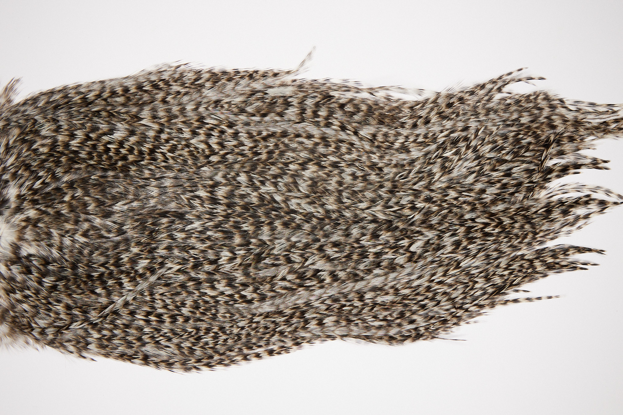 2572 is a Coq De Leon Gold Grade Rooster Cape of CDL Grizzly color that ties predominately size 6-10. The image shown is an actual photo of this dry fly saddle. This is NEW UNUSED HACKLE.