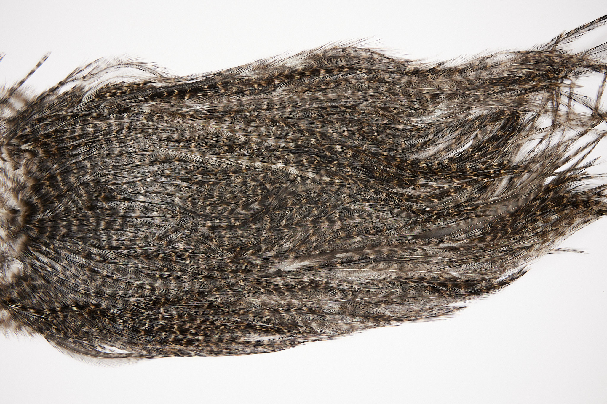 2573 is a Coq De Leon Rooster Saddle of Grizzly color. The image shown is an actual photo of this dry fly saddle. This is NEW UNUSED HACKLE.
