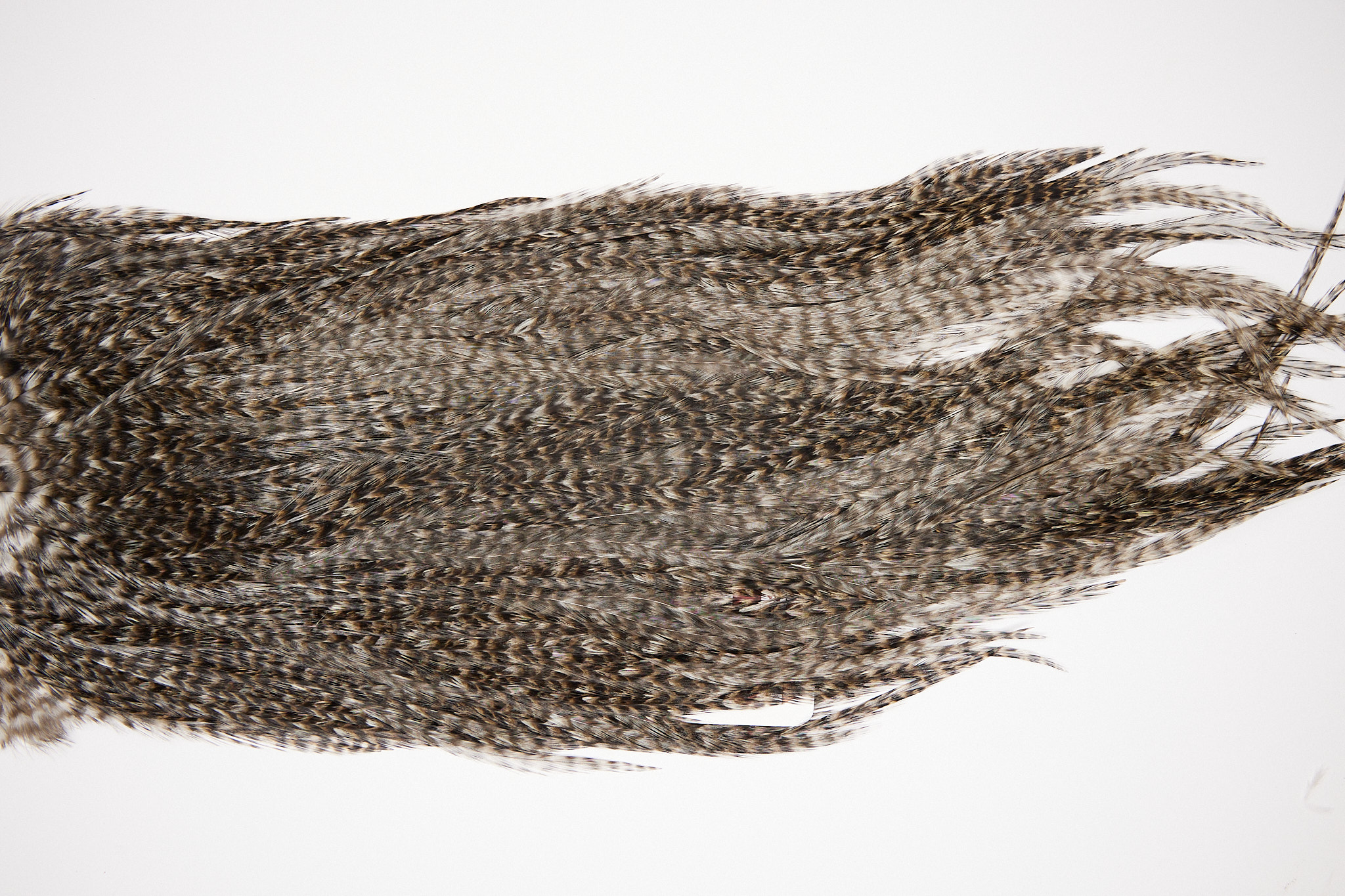 2575 is a Coq De Leon Rooster Saddle of Grizzly color. The image shown is an actual photo of this dry fly saddle. This is NEW UNUSED HACKLE.