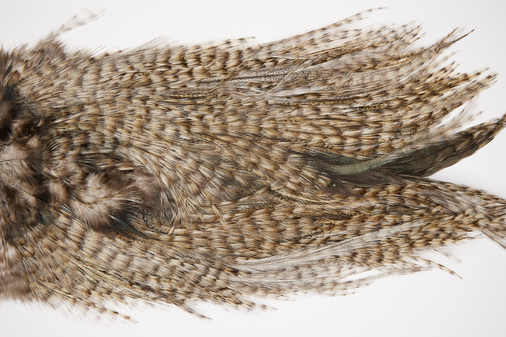 2580 is a Coq De Leon Silver Grade Rooster Cape of Grizzly Pardo color that ties predominately size 4-6. The image shown is an actual photo of this dry fly saddle. This is NEW UNUSED HACKLE.