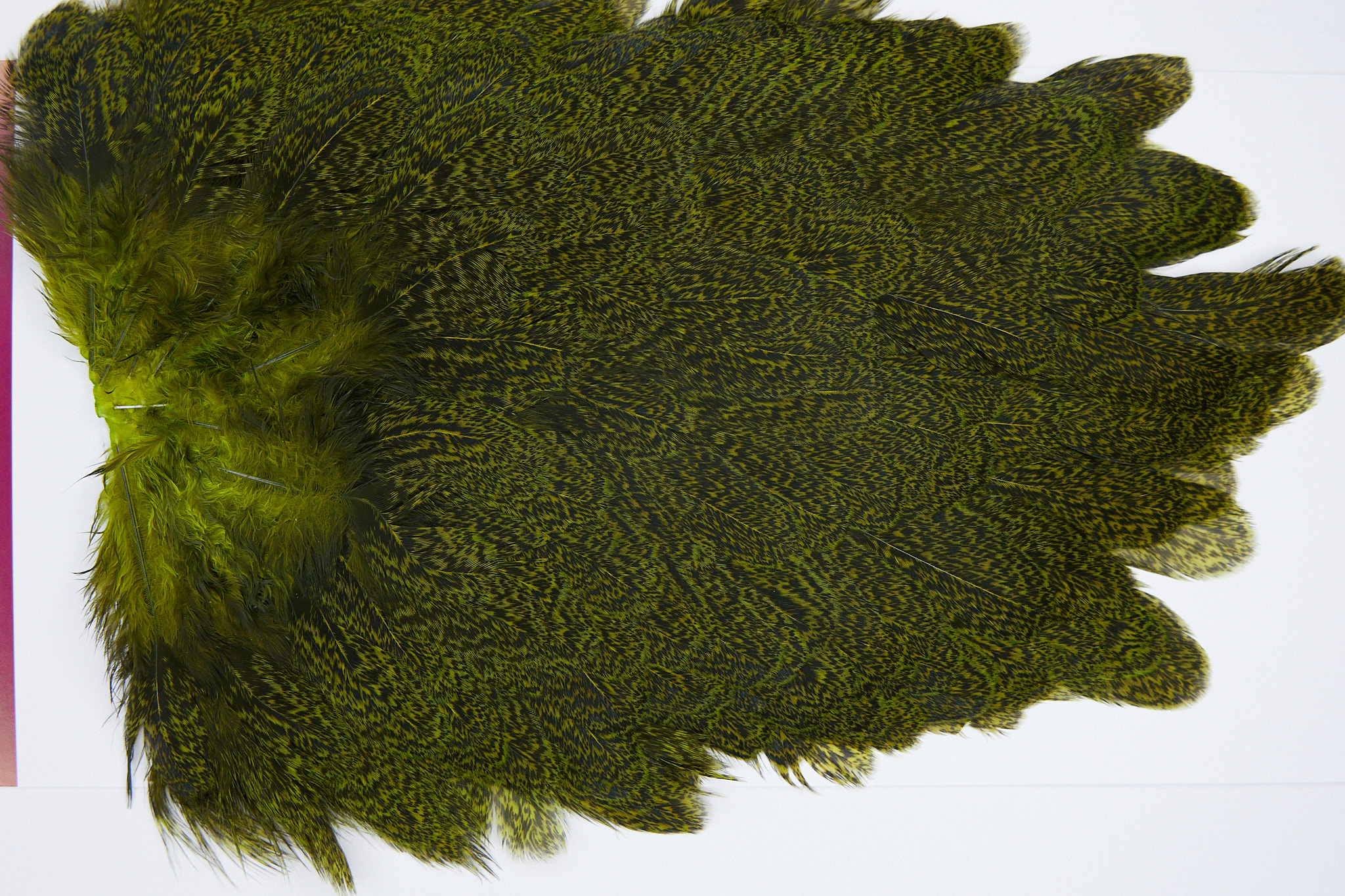 2653 is a Coq De Leon Hen Saddle of Yellow Chartreuse Speckled color. The image shown is an actual photo of this saddle. This is NEW UNUSED HACKLE.