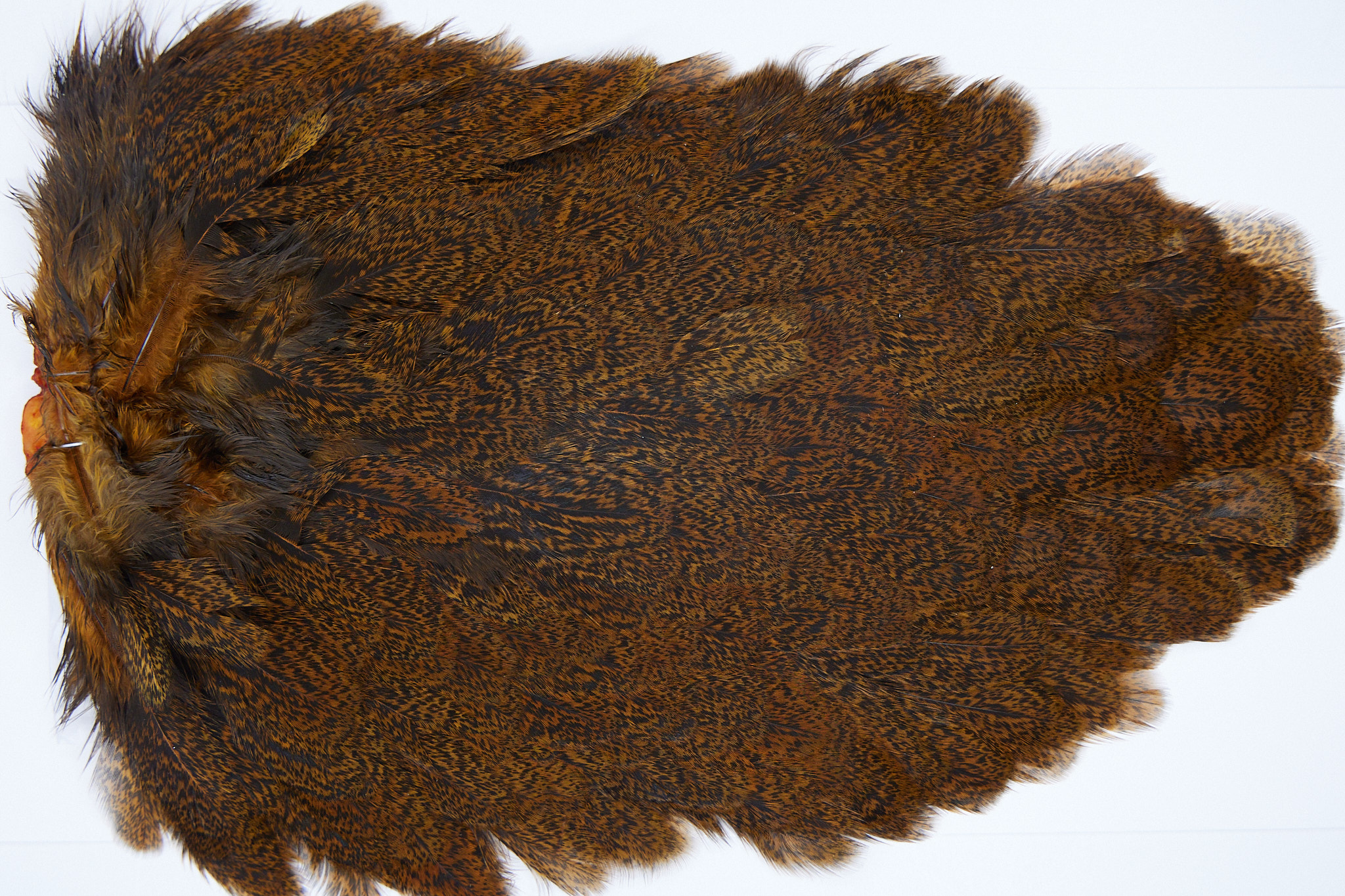 2688 is a Coq De Leon Hen Saddle of Burnt Orange Speckled color. The image shown is an actual photo of this saddle. This is NEW UNUSED HACKLE.
