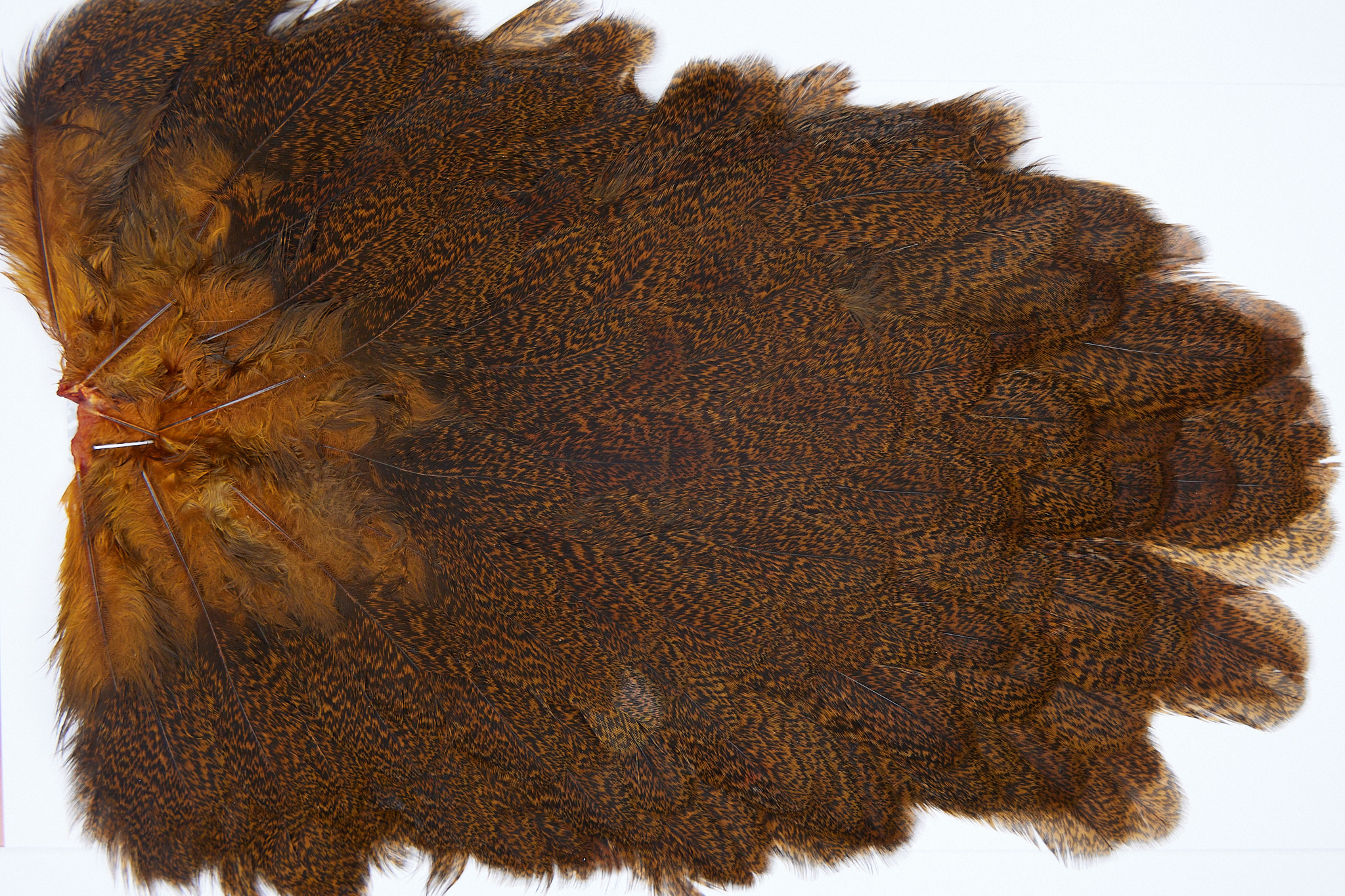 2692 is a Coq De Leon Hen Saddle of Burnt Orange Speckled color. The image shown is an actual photo of this saddle. This is NEW UNUSED HACKLE.